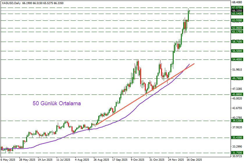 *FED’in bölünmüş bir kararla 25 baz puan faiz indirmesinin ardından güçlü sanayi talebi, azalan stoklar ve “kritik mineral” statüsünün etkisiyle gümüş 64.31 Dolar’a kadar yükselerek rekor üstüne rekor kırmaya devam ediyor.