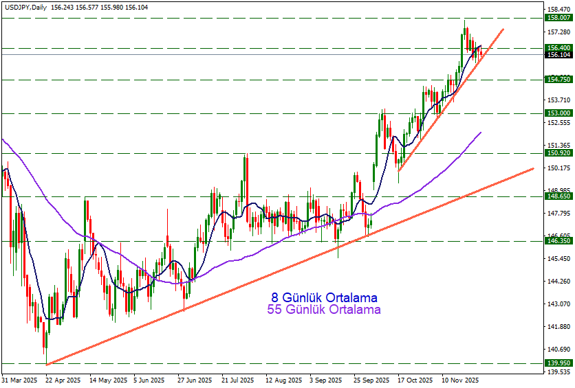 Günlük mumlarla incelediğimiz USDJPY grafiğinde geçtiğimiz hafta 158.00 bölgesinden başlayan aşağı yönlü baskılar haftanın ve ayın son işlem gününde yükseliş trend çizgisini destek olarak takip ediyor. Japon yetkililerin sözlü müdahaleleri şimdilik sadece trend çizgisine kadar etkili oldu. Bu trendin aşağı yönlü kırılması durumunda 154.75 bölgesi destek olarak takip edilebilir. Yukarı yönlü baskıların tekrar gündeme gelmesi durumunda ise 158.00 bölgesi yeniden direnç oluşturabilir.
