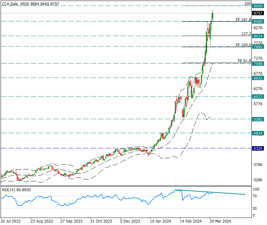 Hafta içerisinde 8490 seviyesindeki dirence hafif bir takıldıktan sonra güçlü trendini sürdürmeye devam etti. Günlük bollinger band’ın üst bölgesi güçlü şekilde yırtılmaya devam ediyor. Dünyanın en büyük üreticileri olan Fildişi Sahili ve Gana’daki arz sıkıntıları bu yükselişin ana sebebi olarak kalmaya devam ederken, finansal piyasalarda güçlü alış dalgası ateşi de sönmek bilmiyor.