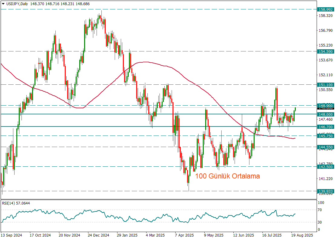 USD/JPY, 100 günlük ortalamanın üzerinde tutunmaya devam ediyor ve bu seviye (146.70 civarı) kısa vadede ana destek konumunda. Fiyat 148.90 direncine yaklaşırken RSI 57 seviyesinde bulunuyor; aşırı alım bölgesinde olmaması yukarı hareket için hâlâ alan olduğunu gösteriyor. 148.90’ın üzerinde kalıcılık sağlanırsa 151.10 ve 154.60 seviyelerine doğru yükselişin devam etmesi beklenebilir. Ancak 147.46 – 146.70 bandının altına inilmesi durumunda satış baskısı artarak pariteyi 145.75’e kadar çekebilir.