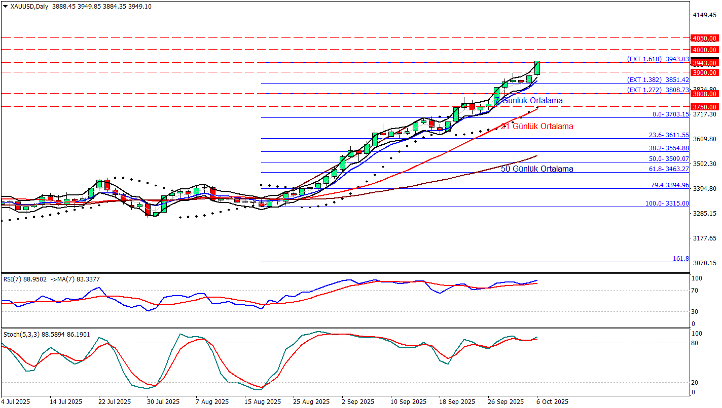 Altın fiyatları güçlü yükseliş trendini sürdürerek 3940 dolar seviyesinin üzerine çıktı ve yeni zirveler test etti. Grafik incelendiğinde, fiyatın 1.618 Fibonacci uzatma seviyesi olan 3943 dolar civarında dirençle karşılaştığı, ancak genel görünümün pozitif kaldığı görülüyor. Kısa vadede 3900 dolar seviyesi ilk destek konumuna gelmiş durumda. Bu seviyenin üzerinde kalıcılık sağlandığı sürece yükseliş eğilimi korunabilir.