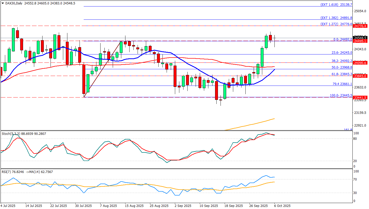 Genel görünüm itibarıyla, DAX30 endeksi güçlü yükseliş trendini koruyor ancak göstergeler kısa vadeli düzeltme riskinin arttığına işaret etmekte. 24.090 seviyesi üzerindeki fiyatlama trendin pozitif kalmasını sağlayabilir.