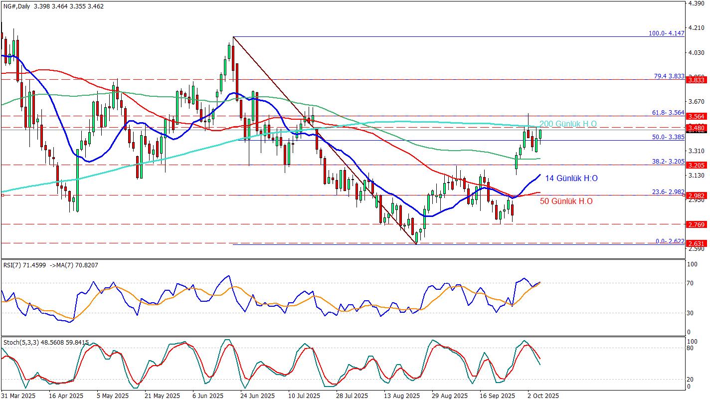 Doğal gaz fiyatları, son dönemdeki güçlü toparlanmanın ardından 3,45 dolar seviyesinde dengelenmiş durumda. Fiyat, kısa vadede 14 günlük hareketli ortalama (mavi) ve 50 günlük ortalama (kırmızı) üzerindeki seyrini koruyarak yükseliş trendinin güç kazandığını gösteriyor. Ancak, yukarıda 200 günlük hareketli ortalama (3,56) güçlü bir direnç alanı oluşturuyor.