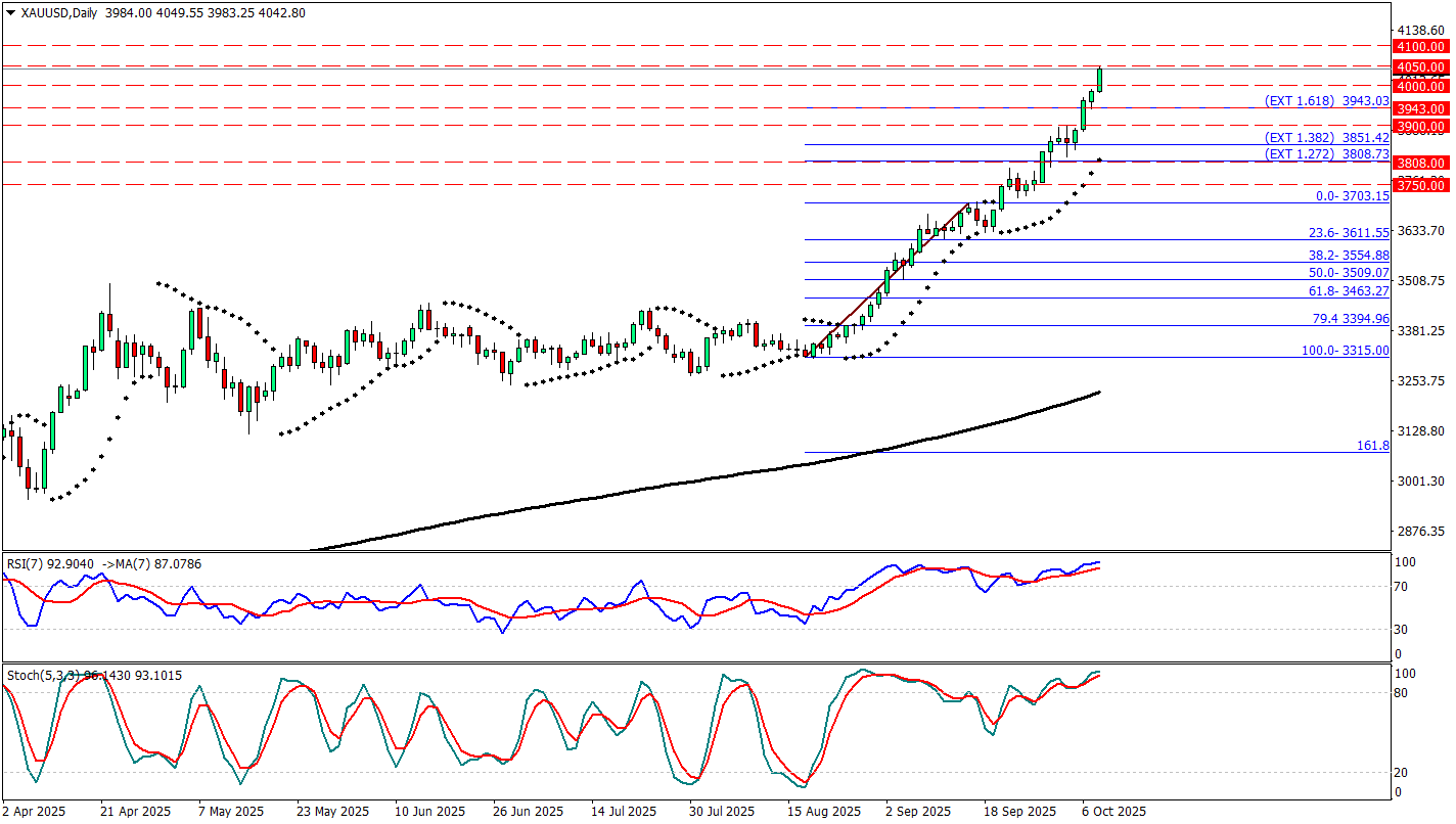 Altının ons fiyatı günlük grafikte şuanda 4039 dolar seviyesinde işlem görürken, güçlü yükseliş trendini sürdürerek 4050 dolar direncini kırmaya çok yakın. Bugün neredeyse 2 tane direnç kıracak olan altın dikkatle takip ediliyor. Fiyat,4000 direnci üstünde kapanış yaparak bu seviyeyi destek haline getirmek istiyor denilebilir. Bu seviye üzerindeki hareket, 4050 ve 4100 dolar dirençlerini hedef konumuna getirecek.