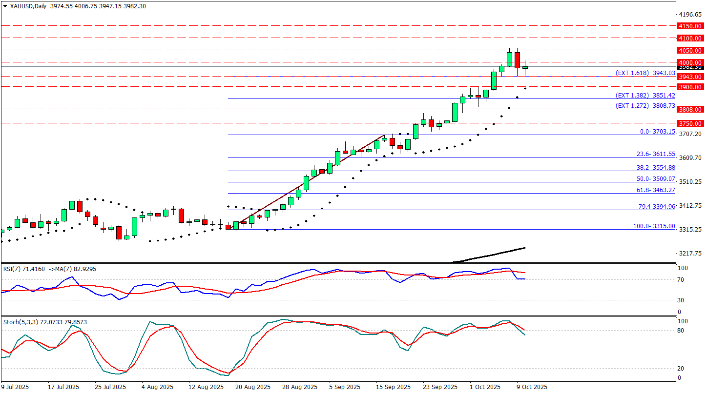 Altın fiyatı güçlü yükseliş trendini sürdürse de, 4.050 dolar seviyesinde zorlanma belirtileri gösteriyor. Fiyat, 4.050 – 4.100 dolar bandındaki güçlü direnç bölgesinden hafif geri çekilerek 4000 – 3943 aralığında dengelenme eğiliminde. Bu seviyenin altındaki olası geri çekilmelerde 3000 ve 3851destekleri öne çıkarken, daha derin düzeltmelerde 3808 ve 3750 seviyeleri izlenebilir.