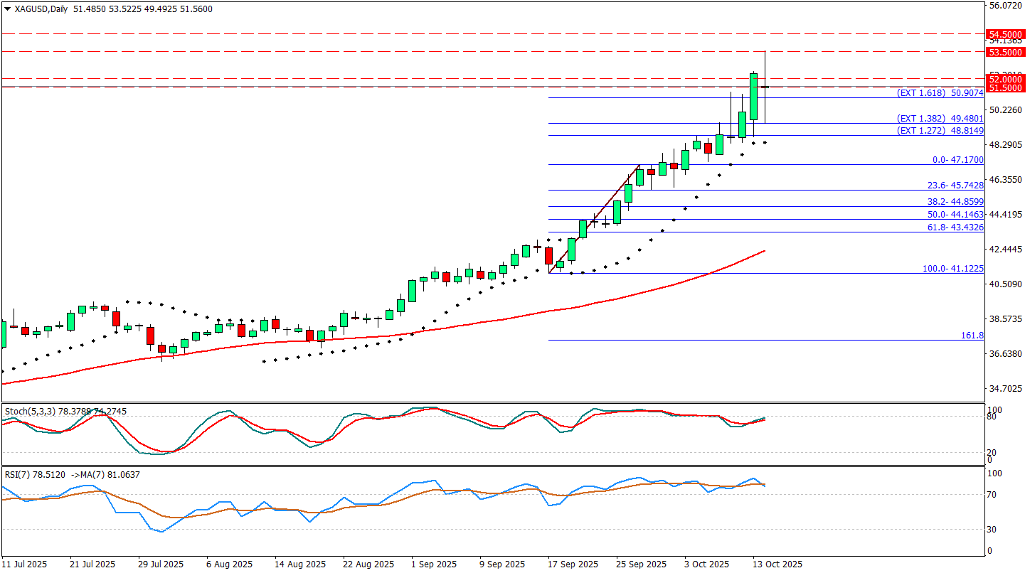 Gümüş’te şuan da spot fiyatın vadeli fiyatlardan daha yüksek olduğu backwardation durumu gözlenmekte. Bu durum piyasada arz endişelerinin yoğun olduğunu, yatırımcıların fiziksel gümüşe ulaşmak için prim ödemeye razı olduğunu ve yakın vadeli kontratlara talebin arttığını gösteriyor. Dolayısıyla, hem teknik hem de piyasa yapısı açısından gümüşte güçlü bir talep eğilimi söz konusu ve bu durum fiyatların 54.50 direncini test etmesini mümkün kılabilir. Bugünde oldukça volatil olan gümüş fiyatı bir ara 53.52’e kadar yükseldi ve sonrasında geri çekildi. Şuan 51.50 ve 52.00 seviyelerinin arasında işlem gören gümüş güçlü talebin varlığı ile tekrar atağa geçebilir. Stokastikte yükseliş ivmesinin devam edebileceğini söylüyor diğer yandan Parabolic Sar’a baktığımızda da aynı şeyi görüyoruz.