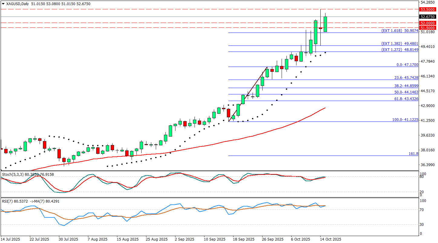 Teknik açıdan bakıldığında, XAG/USD paritesi son dönemde 47,10 dolar seviyesinden başlattığı yükselişini Fibonacci 1,618 uzatma seviyesi olan 52 doların üzerine taşıdı. Fiyatlar şu anda 52,00 – 53,50 dolar bandında dirençle karşılaşıyor. Bu bölge üzerinde kalıcılık sağlanması halinde yükselişin 54,00 dolar seviyesine doğru devam etmesi beklenebilir. RSI göstergesinin 80 seviyesinin üzerinde olması, kısa vadede aşırı alım bölgesine işaret ederken, Parabolic SAR göstergesi ve hareketli ortalamalar güçlü yükseliş trendini teyit ediyor. Genel görünüm, 51 dolar üzerinde kalındığı sürece gümüşte pozitif ivmenin korunacağına işaret ediyor.