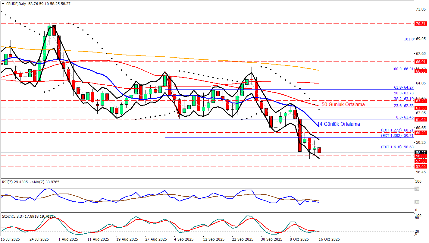 Günlük grafikte görüldüğü üzere CRUDE fiyatı, düşüş kanalının alt bandına yakın seviyelerde işlem görüyor. Fiyat 50 günlük hareketli ortalama (kırmızı) ve 14 günlük kısa vadeli ortalamanın (mavi) altında seyrederek düşüş trendinin korunduğunu gösteriyor. Son dönemdeki satış dalgası, Fibonacci uzatma seviyelerinde %161,8 (58,63) bölgesine kadar derinleşmiş durumda. Bu bölge kritik bir teknik destek olarak öne çıkıyor.
