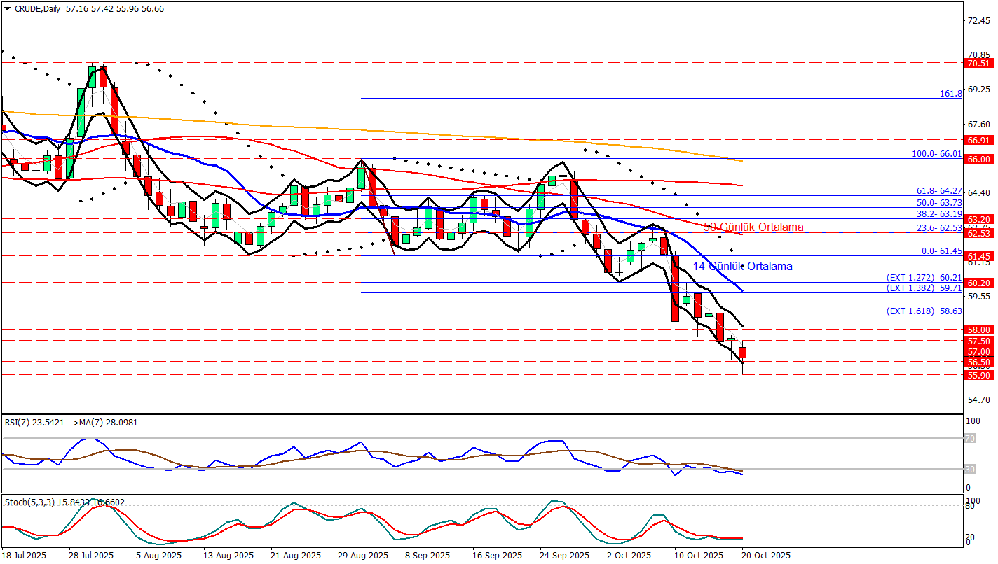 CRUDE fiyatı , son günlerdeki satış baskısının ardından düşüş trendini sürdürerek 56,60 dolar seviyelerinde işlem görüyor. Fiyat, hem 14 günlük hareketli ortalamanın hem de 50 günlük ortalamanın belirgin şekilde altında kalmaya devam ederken, kısa vadede aşağı yönlü eğilimin korunduğu görülüyor.