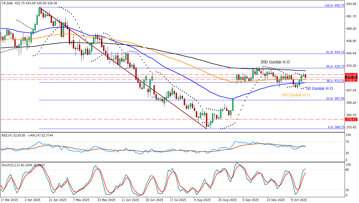 Teknik olarak baktığımızda ise; son günlerde yaşanan toparlanmanın ardından 420 dolar civarında yatay bir seyir izliyor. Günlük grafikte fiyat, 50 ve 100 günlük hareketli ortalamaların hemen üzerinde dengelenmeye çalışırken, 200 günlük ortalamanın altında kalmaya devam ediyor. Bu durum, orta vadede yukarı yönlü momentumun henüz tam olarak güç kazanamadığına işaret ediyor.