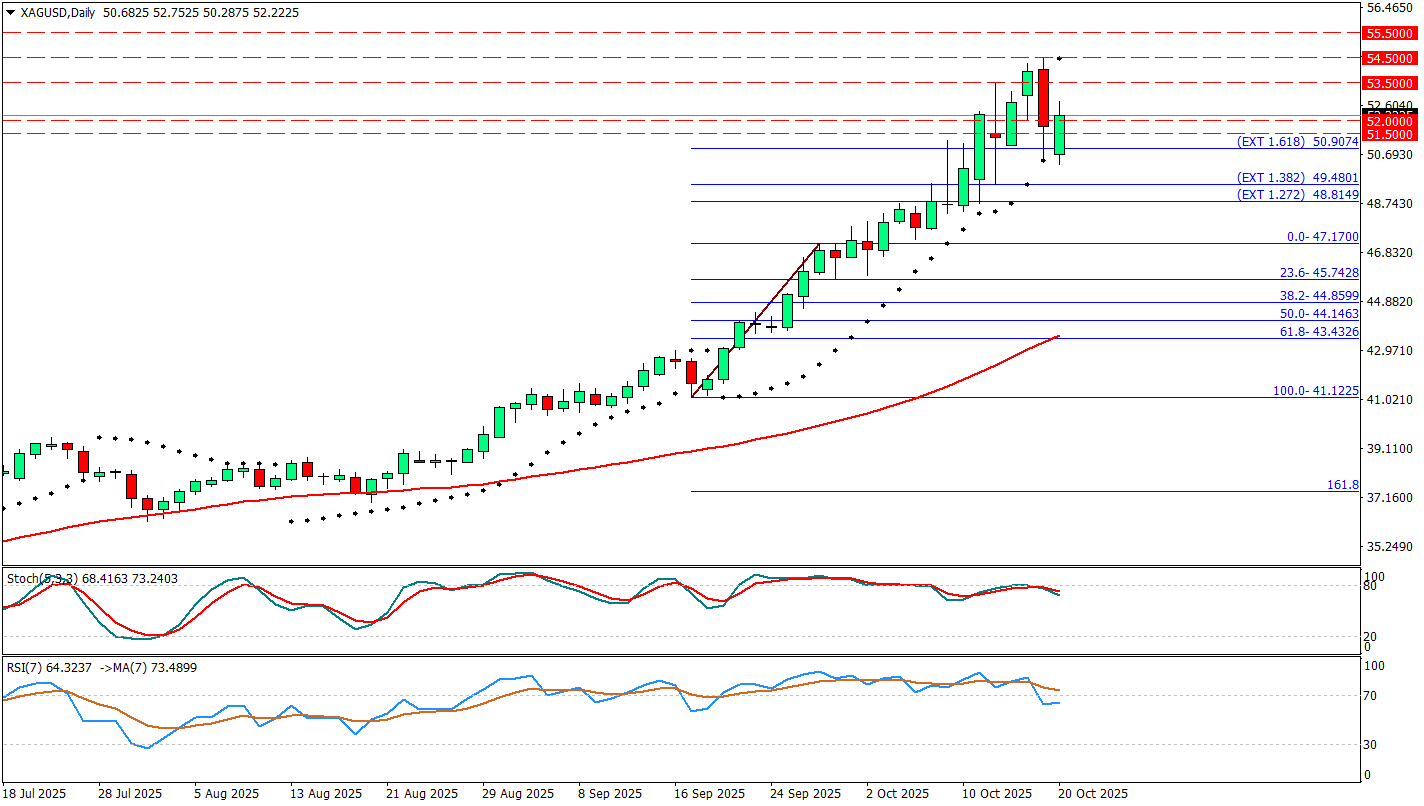 Gümüş fiyatı, güçlü yükseliş trendinin ardından 52 dolar seviyesinde dengelenme çabasını sürdürüyor. Parabolic SAR göstergesi trendin halen yukarı yönlü olduğunu teyit ediyor. Ancak son geri çekilme, momentumun bir miktar zayıfladığını işaret ediyor. Buna rağmen gümüş bugün bir ara %4’e varan bir yükseliş göstermeyi başardı. Şuan 52 seviyesinin üstünde tutunmaya çalışıyor ve burada tutunmayı başarırsa tekrar 53.50 seviyeleri hedeflenebilir. Stokastic grafiğinde de net bir dönüş sinyali bulunmuyor. RSI ise pozitif bir sinyal üretiyor ve yükselişin devam edebileceğini belirtiyor.