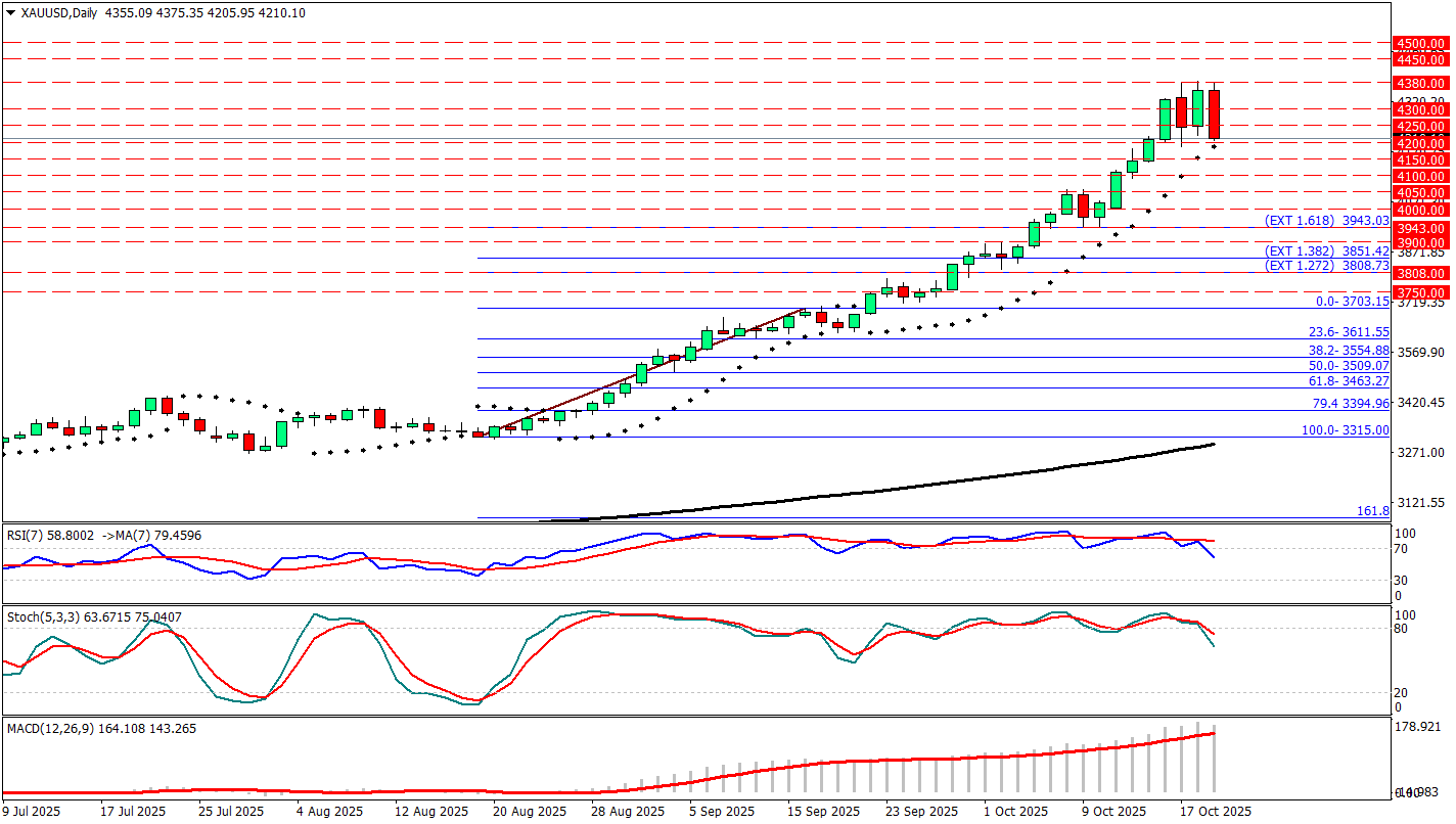 Altın, dün 4.381 dolar seviyesini gördü ve sonrasında ikinci kez dirençle karşılaştı ve bugün 150 dolardan fazla gerileyerek önceki günkü kazançlarını sildi. Değerli metal, artan risk iştahı ve güçlenen ABD Doları nedeniyle baskı altında kaldı. Öte yandan ABD Başkanı Trump, pazartesi günü yaptığı açıklamalarda piyasaları rahatlattı. Trump, gelecek hafta Çin Devlet Başkanı Xi Jinping ile görüşmeyi planladığını ve “adil bir anlaşmaya” ulaşabileceklerine inandığını söyledi. Ayrıca, Çin’in Tayvan’ı işgal etmeyi planlamadığını belirterek bu konudaki gerginlik endişelerini hafifletti. Doğal olarak bu açıklamalar risk iştahını artıran ana unsurlar olunca Altın bir gerileme yaşadı.