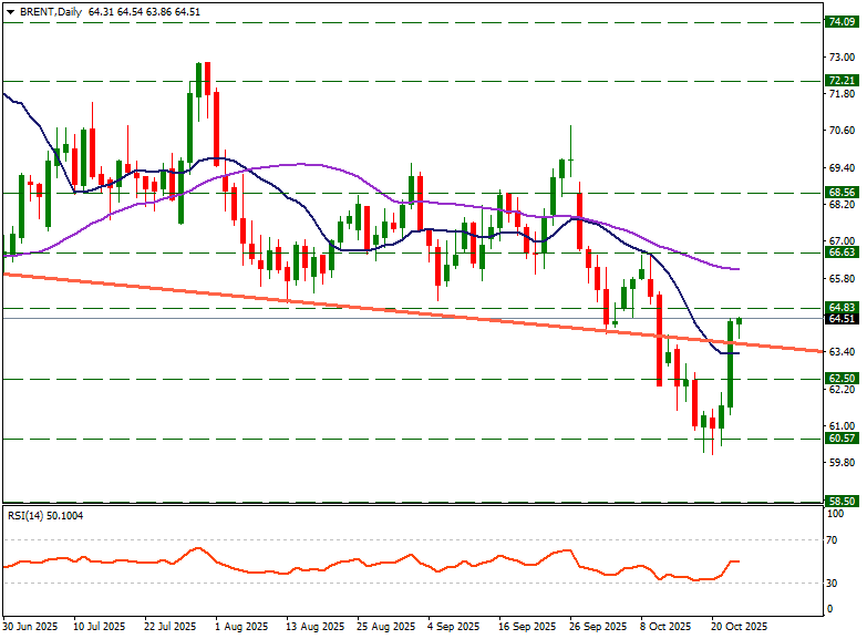 Trump, iki büyük Rus petrol üreticisine yaptırım uygulanacağını açıkladı. Brent petrol bu haber sonrasında önce 62.50 direncini ardından 14 günlük hareketli ortalama ve düşüş trend çizgisini aştı. Yükselişler en yüksek 64.54 seviyesini görürken RSI indikatörü bu yükselişe rağmen 50 bölgesinde dengeye geldi. Yukarı yönlü fiyatlamaların etkili olmaya devam etmesi durumunda gün içinde 64.83 bölgesi direnç oluşturabilir. Son zamanlarda etkili olan düşüş trendinin ardından yükseliş trendi oluşup oluşmayacağını haber ve fiyat akışlarını takip ederek göreceğiz.
