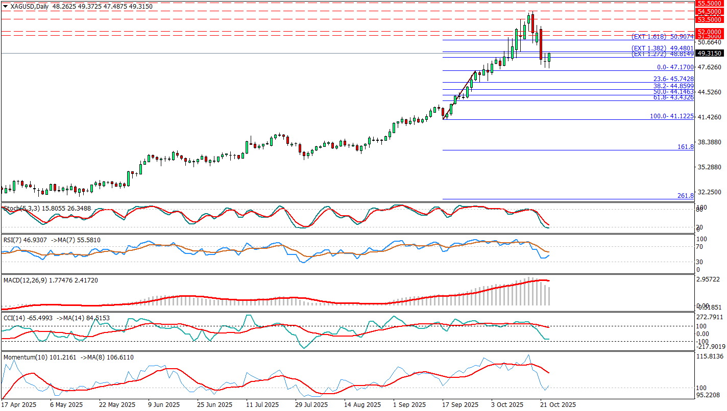 Gümüş fiyatı, son iki gündeki kayıpların ardından 49 $ civarında dengelenerek toparlanma sinyalleri veriyor. Piyasalar, ABD hükümetinin uzun süren kapanmasının ardından açıklanması geciken makroekonomik veriler nedeniyle belirsizlik ortamında temkinli davranıyor. Bu durum, faiz getirisi olmayan gümüş gibi güvenli liman varlıklarına yönelimi destekliyor. Özellikle cuma günü açıklanacak olan Eylül ayı ABD enflasyon verisi öncesinde yatırımcıların pozisyon alma isteği sınırlı kalırken, FED’in 29 Ekim toplantısında 25 baz puanlık faiz indirimi yapacağına dair güçlü beklentiler, gümüşe talebi canlı tutuyor. Ancak 17 Ekim’de görülen 54,45$’lık rekor zirve sonrası oluşan aşırı alım koşulları, kısa vadede teknik düzeltmeleri beraberinde getirdi. Öte yandan ABD-Çin arasında ticari iyimserliğin yeniden güç kazanması, güvenli liman talebini zayıflatarak yukarı hareketi sınırlayabilir. Genel görünümde, FED’in gevşeme eğiliminin sürmesi ve veri akışındaki belirsizlik, gümüş için orta vadede destekleyici olmaya devam ediyor.
