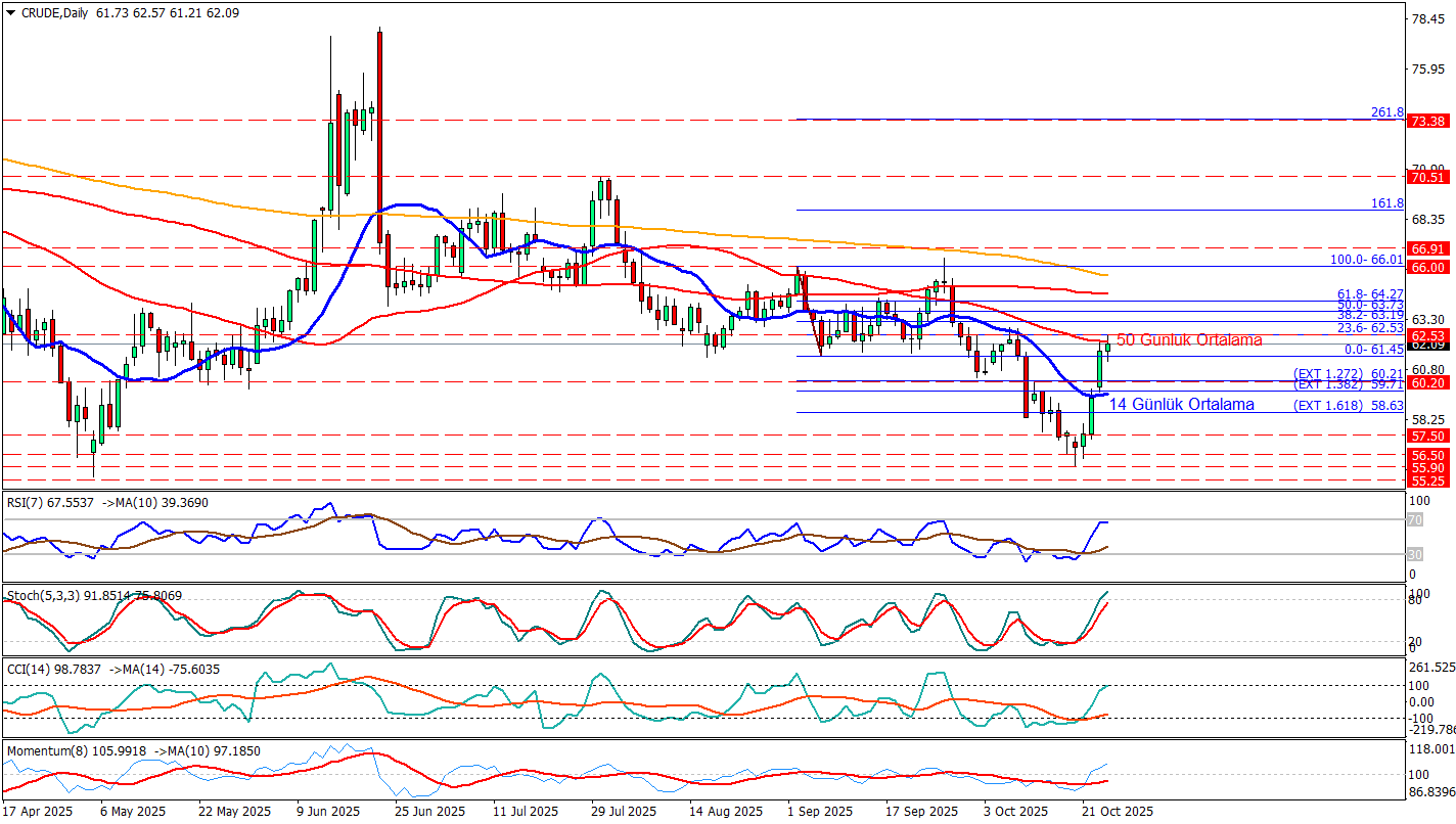 CRUDE fiyatı son günlerde dip seviyelerden toparlanma çabası içerisinde olup, 62 dolar civarında dengelenmiş durumda. Fiyatın 14 günlük ortalama (59.71) üzerindeki tutunma çabası ve 50 günlük ortalama (62.50) seviyesine kadar yükselmesi, kısa vadede alıcıların yeniden devreye girdiğini gösteriyor. Ancak bu bölge, aynı zamanda önemli bir direnç eşiği niteliğinde. Fiyat 50 günlük ortalamanın üzerinde kapanış yapabilirse 63 ve 64 seviyelerinde bulunan dirençler sonraki hedefler olarak öne çıkıyor.