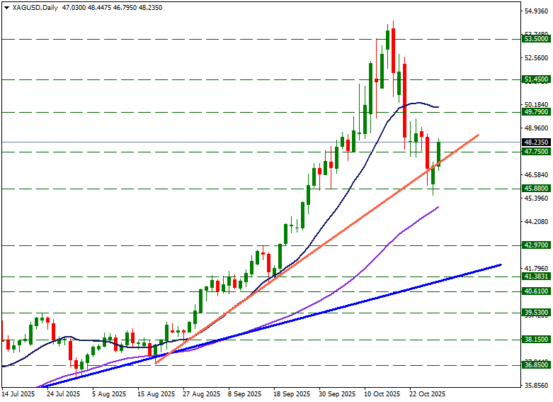 Gümüş fiyatları geçtiğimiz gün yükseliş trend çizgisini aşağı yönlü kırarak 45.54 seviyesine kadar düşüşler görse de gün sonunda toparlayarak trend çizgisinde kapanış yaptı. Yeni işlem gününde alıcılar etkin kalmaya devam etti ve 48.44 seviyesine kadar yükselişler yaşandı. Anlık fiyatlamalar gün içi zirveye yakın kalmaya devam ediyor. Bu akşam saat 21:00’de açıklanacak FED faiz kararı ve ardından FED Başkanı Powell’ın yapacağı konuşma ile gümüş fiyatlarında ani değişimler yaşanabilir. Yukarı yönlü fiyatlamaların devamında 49.79 bölgesi direnç, aşağı yönlü fiyatlamalarda ise 47.75 ve yükseliş trend çizgisi destek oluşturabilir. Trend çizgisi altına sarkmalarda 45.88 bölgesi tekrar destek oluşturabilir.