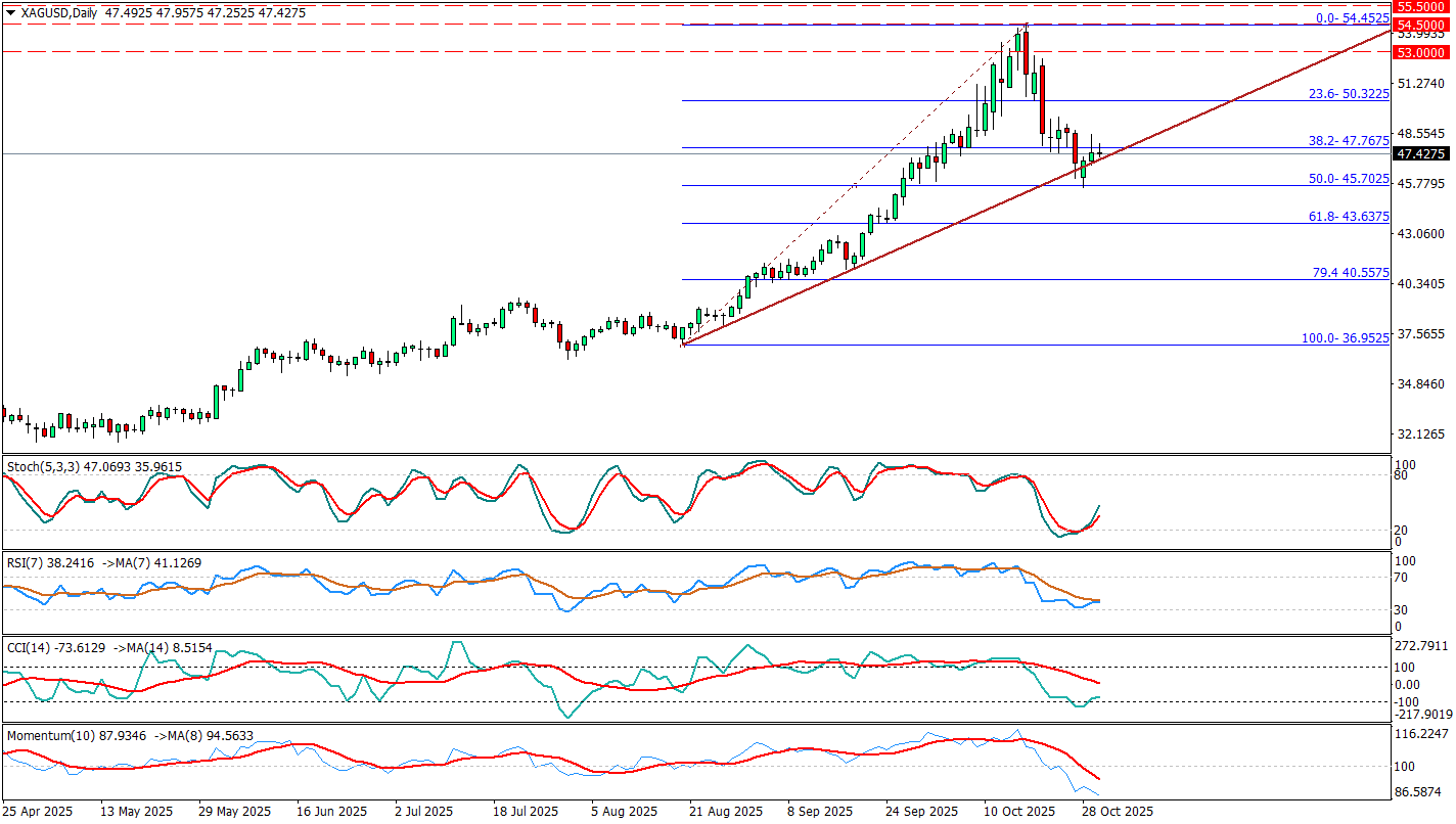 Ons gümüş nispeten altına göre daha pozitif bir görünüm veriyor diyebiliriz. Şuan tekrar 20 ağustostan gelen trend çizgisinin üzerine atmayı başardı ve 47.76 direncini test etmeye hazırlanıyor. Bu hazırlığı Stokastik’e bakınca görebiliyoruz. Stokastik aşırı satım bölgesinden çıkarak yükseliş izlenimi yaratıyor. Aynı şekilde RSI’da öyle ve yükselmeye devam ediyor. CCI tararafında henüz net bir şey yok. Momentuma baktığımızda ise düşen bir resim görüyoruz ve buda yükselişin sınırlı kalabileceği ve satış baskısının artabileceği izlenimini yaratıyor.