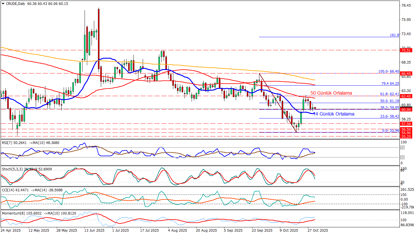 Crude Oil fiyatları, son haftalarda arz fazlası endişelerinin yeniden gündeme gelmesiyle yukarı yönlü momentumunu kaybetmiş durumda. Fiyat, kısa vadede 60 dolar civarındaki 50 günlük hareketli ortalama seviyesinin altında dalgalanıyor ve bu bölge 60-61 güçlü bir direnç konumunu koruyor. Yukarı yönlü hareketlerde 62,40 – 64,25 dolar aralığı Fibonacci düzeltme seviyeleriyle örtüşen önemli direnç alanı olarak öne çıkarken, aşağı yönlü olası geri çekilmelerde 58,40 – 57,50 dolar destek bölgesi ilk savunma hattı olarak izleniyor. RSI göstergesi 50 seviyesinde nötr bölgede seyrederek yön konusunda kararsız bir görünüme işaret ediyor. Stokastik göstergede olası aşağı kesişim satış baskısının sürebileceğine işaret ederken, CCI ve Momentum göstergeleri de zayıf toparlanma eğilimi gösteriyor.