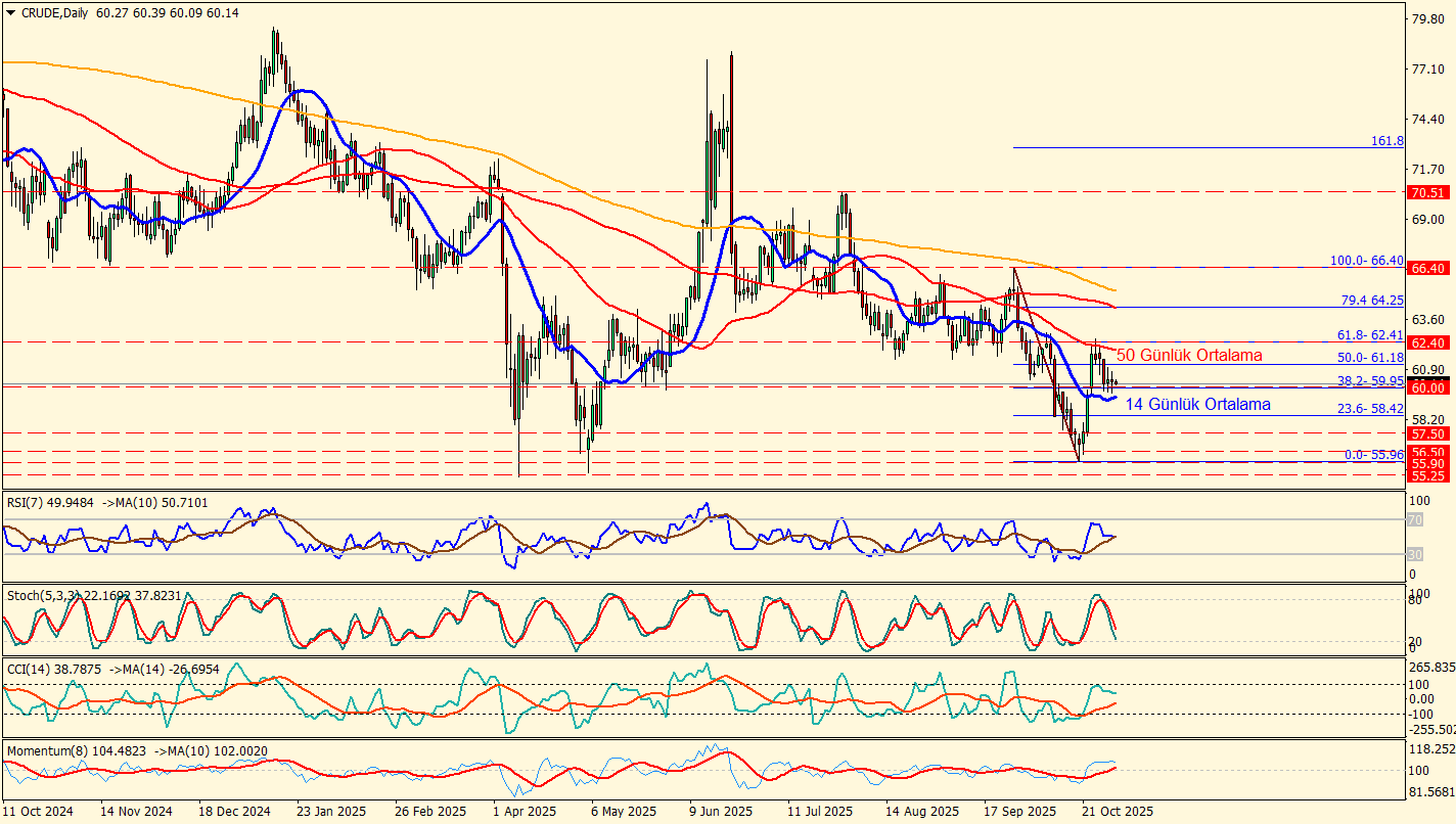 Stokastik aşırı satım bölgesine yaklaşmış bulunuyor. CCI ise nötr bölgeye yaklaşıyor. Momentum ise hala güçlü ama azalmaya başladı. RSI’da nötr bölgede. Kısacası göstergeler tarafında henüz toparlanmaya dair bir görünüm yok. Fiyatların geleceği daha çok Opec+ toplantısının sonucuna bağlanmış bir izlenim var diyebiliriz.