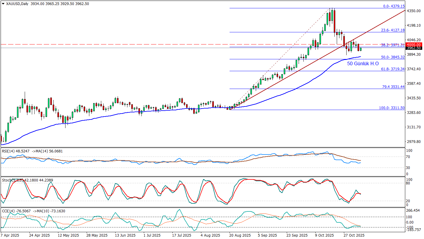 Teknik tarafta ise; fiyatlar tekrar 3971 ve 4000 seviyeleri geri kazanamaya çalışıyor. Stokastik yükseliş yönlü bir görünümde henüz değil. CCI ise -100 sınırının üzerinde çıktı ve hafif bir yukarı ivmelenme sergiliyor. RSI ise nötr bölgede seyrediyor ve net bir izlenim henüz yok. Eğer fiyatlardaki satış derinleşirse ilk takip edilecek bölge ise 3845 seviyesi olarak öne çıkıyor.
