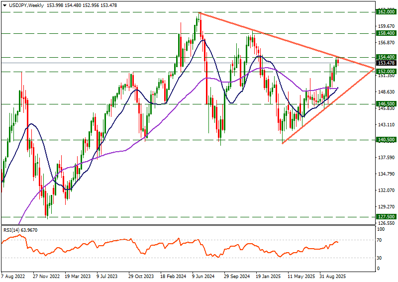 Haftalık grafikte incelediğimiz USDJPY paritesi bir yıldan uzun süredir oluşturduğu üçgen formasyonunda üst bandı test ediyor. Şimdilik üst bant başarılı şekilde direnç oluşturmuş gibi gözükse de 14 haftalık hareketli ortalamanın 50 haftalık hareketli ortalamayı yukarı yönlü kesmesi dikkat çekiyor. Bu görünüm yukarı yönlü fiyatlamaların gündeme gelebileceğinin habercisi olabilir. Önümüzdeki günlerde fiyatlamaları temkinli bir şekilde takip etmekte fayda var. Yen lehine tepkilerde 152.00 bölgesi ve ardından yükseliş bandı destek olarak takip edilebilir.