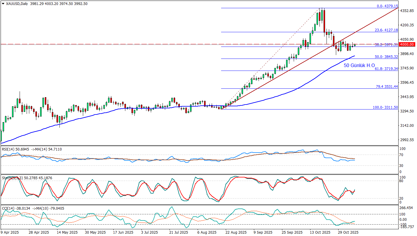 ABD’de hükümet kapanması ve tarifelerde belirsizlik güvenli liman talebini canlandırdı: Altın fiyatı ons başına yaklaşık 4000 dolar civarına çıkarken, dolar endeksinin dört aylık zirveden gerilemesi ve piyasaların uzun sürebilecek ABD hükümet kapanması ile Trump yönetiminin gümrük vergilerinin yasallığına ilişkin Yüksek Mahkeme şüphelerinden dolayı güvenli liman arayışına yönelmesi etkili oldu. Diğer bir husus Güçlü ADP verilerine rağmen riskten kaçış altını destekledi: 5 Kasım’da ABD’nin özel sektör istihdamı 42 bin artarak beklentileri aşmasına rağmen hisse piyasalarında değerleme endişeleri ve yapay zekâ hisselerinin balonlaşabileceği korkusuyla risk iştahı azaldı; bu ortamda ons altın %1,5’dan fazla yükselerek 4000 dolar sınırına ulaştı.
