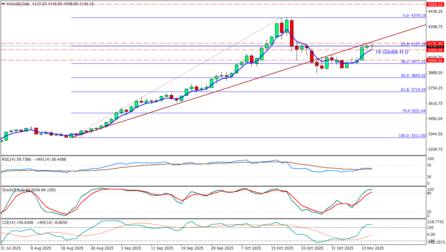 Ons altında fiyatlamayı belirleyen ana tema, zayıf ABD verilerinin Fed’in Aralık’ta yeniden faiz indirme ihtimalini güçlendirmesi oldu. Geçen haftaki istihdam kaybı ve gerileyen tüketici güveni sonrası, pazartesi günü gelen haber akışıyla piyasalarda Aralık’ta faiz indirimi olasılığı %65’lere taşındı; bu tablo, faiz getirisi olmayan altına olan talebi artırarak ons fiyatını 2 haftanın zirvesi olan 4.100 dolar civarına taşıdı.