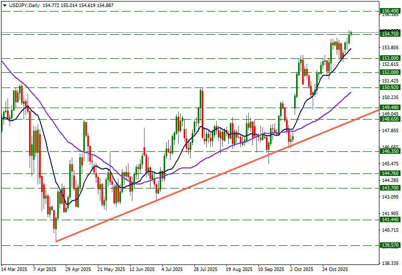 USDJPY paritesindeki yükselişler 14 günlük hareketli ortalama ivmesini takip ederken 154.75 bölgesindeki direnci test etmeye devam ediyor. Direnç üzerine hafif çıkışlar gündeme gelse de henüz güçlü bir kırılım gerçekleşmedi. Yen aleyhine fiyatlamaların güç kazanmaya devam etmesi durumunda 156.40 bölgesi adım adım gündeme gelebilir ve bir sonraki direnç olarak karşımıza çıkabilir. Yen lehine düzeltme hareketlerinde ise 153.00 bölgesinde alıcılar öne çıkabilir.