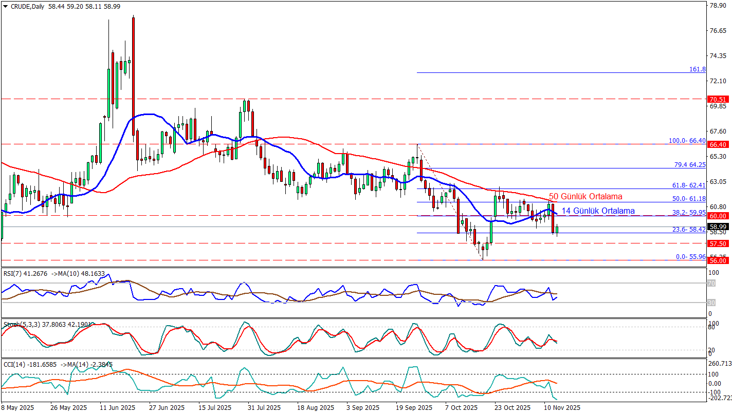 Crude Oil (WTI) fiyatı son günlerde 58–60 USD bandında dalgalanıyor; 12 Kasım’da OPEC’in 2026’da arzın talebe denk geleceğine ilişkin raporu sonrası fiyatlar 2 USD’den fazla gerileyerek 58,49 USD’ye inmişti, bugün ise hafif toparlanmasına rağmen 58–59 USD bölgesinde kaldı. 43 günlük ABD hükümet kapanmasının 12 Kasım’da imzalanan bütçe yasası ile sona ermesi tüketim ve yakıt talebinin toparlanacağı beklentisini güçlendirdi ancak makro dinamikler hâlâ ağırlıklı olarak düşüş yönlü. OPEC+’ın Nisan’dan bu yana üretim hedeflerini yükseltmesi ve artışlara Aralık sonuna kadar devam etmeyi planlaması, ABD Enerji Enformasyon İdaresi’nin (EIA) küresel petrol stoklarının 2026’ya kadar artmaya devam edeceği ve bu nedenle fiyatların önümüzdeki aylarda baskı altında kalacağı öngörüsüyle birleşiyor.