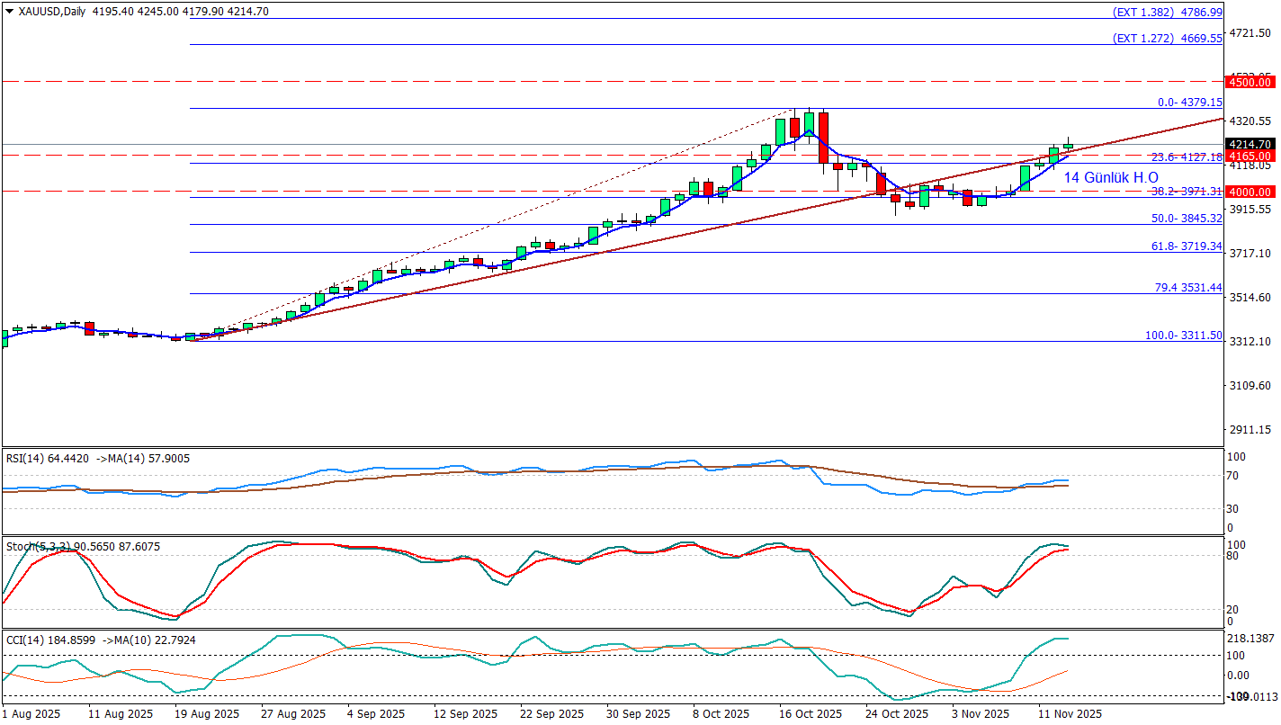 7 günlük bir yükseliş serisinin içerisinde olan altında RSI aşırı alıma yaklaşmış, Stokastik ise aşırı alım bölgesinin içerisinde yatay bir görünüm sergilemeye başlamış durumda. CCI da +100 sınırının net bir şekilde üstünde dolaşması bu 7 günlük seriden sonra düzeltme ihtimalini arttırmakta. Bu düzeltme 4380 bölgelerine yaklaşınca daha yüksek bir ihtimal kazanacaktır o yüzden bu seviyelere yaklaşma durumunu dikkatli izlemekte fayda var.