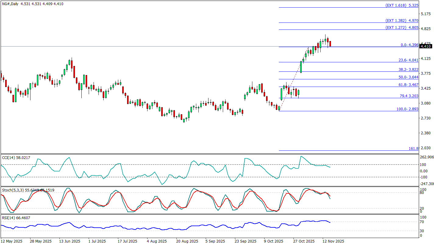 Grafikte Doğalgaz günlük tarafta Ekim’den bu yana süren sıkışmanın ardından son haftalarda yukarı yönlü, kademeli bir trend görüyoruz; fiyatlar son günlerde ardışık yeşil mumlarla yükselmiş, RSI 70 seviyesine yaklaşarak güçlü momentumu, CCI pozitif bölgede alım yönlü iştahı, Stokastik ise aşırı alım bandından aşağı dönmeye hazırlanarak kısa vadede “yorulma” ve kâr realizasyonu sinyallerini veriyor; son gündeki belirgin kırmızı mum da tam olarak bu kâr satışını yansıtıyor. Bu teknik tablo, son 3–4 gündeki temel akışla uyumlu: Doğalgaz vadeli kontratları, Aralık ve Ocak için beklenen daha soğuk hava koşulları ve rekor düzeylere yaklaşan LNG ihracatı sayesinde 4,68 civarına çıkarak 2022 Ukrayna işgali sonrası görülen zirvelere yakın seviyelere tırmandı; talep tarafındaki bu güçlenme yükseliş trendini destekledi. Ancak hafta sonunda açıklanan EIA depolama raporu, stokların beklentilerin üzerinde 45 Bcf artarak toplam 3.960 Bcf’ye ve beş yıllık ortalamanın yaklaşık %4,5 üzerine çıkmasıyla piyasaya “arz rahat, stoklar konforlu” mesajı verdi ve vadeli fiyatlarda bir günde %4’ü aşan geri çekilmeyi tetikledi; aynı anda hava tahmin modellerinde Kasım sonu için daha ılıman sıcaklıkların öne çıkması ısınma talebine dair beklentileri aşağı çekerek satış baskısını artırdı. Böylece hem teknik göstergelerdeki aşırı alım bölgesinden dönüş, hem de depolama verisi ve ılıman hava beklentileri kaynaklı bu haber akışı, grafikte gördüğümüz son kırmızı mumla temsil edilen kısa vadeli düzeltmeyi yaratırken, orta vadede yükseliş trendi ve yüksek talep teması şimdilik korunuyor.