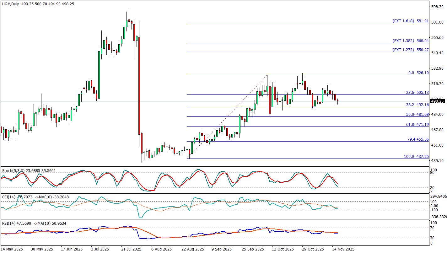 ABD’de hükümetin yeniden açılmasıyla belirsizliğin azalması, Çin’in büyümeyi desteklemek için gevşek para politikasını ve altyapı odaklı teşviklerini sürdüreceğini açıklaması ve Codelco gibi büyük üreticilerdeki üretim düşüşlerinin arz tarafında kronik sıkışıklığı beslemesi fiyatı desteklemeye devam etmekle beraber şuan yatay bir seyir halinde ilerliyor. Son iki günde ise Fed üyelerinin Aralık’ta ek faiz indirimi konusunda isteksiz, enflasyona karşı hâlâ temkinli mesajlar vermesi sonucu Aralık indirimi beklentileri geriledi, bunun sonucunda doların güçlenmesi ve dolar bazlı fiyatlanan bakırda satış baskısının artması söz konusu. Bu gelişmelerin ışığında ise son 4 gündür düşüş gösteren bakırın 492 seviyesinden toparlanması durumunda tekrar 505 seviyesini test etmek için yükselişe geçmesi muhtemel. 492 aşağı kırılırsa 50 Fibo düzeltmesi ilk önemli destek seviyesi durumunda.