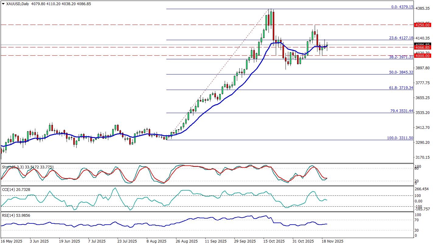 Ons altın, grafikte görüldüğü gibi; son haftada yükselişin bir kısmını geri vererek hareketli ortalama çevresinde daha yatay/sıkışık bir görünüme geçti ve momentum göstergeleri nötr bölgede soğumaya işaret ediyor. Bu geri çekilmede özellikle FED’in Aralık’ta faiz indirimi ihtimalinin güçlü ABD verileri ve bazı şahin mesajlarla gerilemesi, dolar ve tahvil faizlerini destekleyerek altın üzerinde baskı kurması etkili oldu Öte yandan süregelen jeopolitik/ticaret tarifesi belirsizlikleri güvenli liman talebini canlı tutarken, merkez bankalarının yüksek seyreden alımları ve ETF tarafındaki güçlü girişler orta-uzun vadeli zemini desteklemeye devam ediyor.