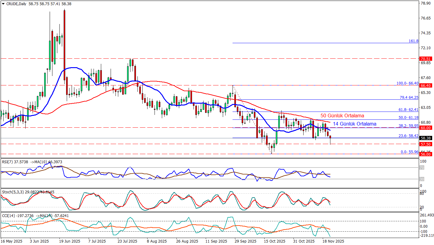 Crude fiyatları son günlerde artan arz fazlası beklentisi ve jeopolitik risk priminin zayıflamasıyla baskı altında; OPEC+’ın kademeli üretim artışlarına devam etmesi ve 2026’ya doğru daha büyük bir küresel arz fazlası ve artan stoklar öngörülmesi piyasada “arz fazlası” temasını güçlendirirken, güçlü dolar ve ABD stok verilerindeki dalgalı ama genel olarak yüksek seyir de toparlanmayı sınırlıyor. Günlük grafikte Eylül sonundaki 66,4 zirvesinden sonra sert satışla 56 bölgesine kadar geri çekilen fiyatın, toparlanma denemelerinde 50 günlük ortalama ve 61,2–62,4 bandı altında kalarak daha düşük tepe yapması orta vadede negatif yapıyı koruduğunu gösteriyor; halen 14 günlük ortalamanın da altına sarkan fiyat 58,4 civarındaki %23,6 fibo/pivot bölgesinde tutunmaya çalışıyor. RSI’ın 38 seviyesinde 50’nin altında kalması trendin zayıf olduğunu, CCI’ın -100’ün belirgin altında seyretmesi satış baskısının hâlâ güçlü olduğunu, Stokastik’in 30 bandına yakınlaşması ise kısa vadede “tepki alımı” potansiyelini işaret ediyor. Bu çerçevede 58,4 üzerinde kalıcılık sağlanırsa önce 60,0 ve 61,2–62,4 bandına doğru sınırlı bir toparlanma alanı oluşabilir; buna karşın 58,4 altındaki kapanışlar 57,5 ara eşiğini kırarak 56,0 dip bölgesine doğru düzeltmenin derinleşme riskini artırır.
