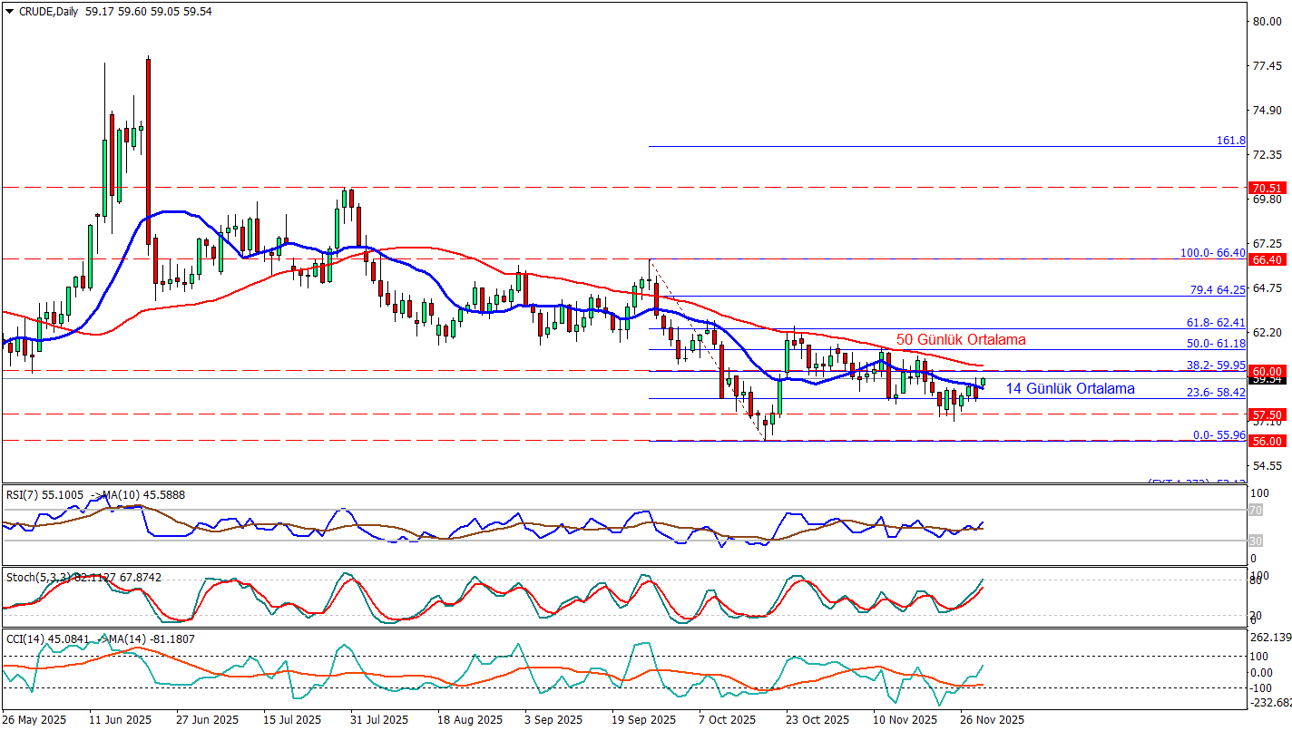 Crude Oil grafiğinde kısa ve orta vadede hâlâ aşağı eğilimli bir yapı görüyoruz. Fiyat 14 günlük ortalamanın hemen üzerinde, 50 günlük ortalama (kırmızı) ise yaklaşık 60,00–60,50 bölgesinde güçlü bir dinamik direnç olarak çalışıyor; bu nedenle 60,00 üzeri günlük kapanışlar gelmedikçe yükselişlerin şimdilik tepki niteliğinde kalma riski yüksek. RSI’ın 50 eşiğinin biraz üzerine çıkması kısa vadede momentumun zayıf da olsa alıcılara geçtiğini, Stokastik osilatörün 80 üzerine tırmanması ise kısa vadede aşırı alım bölgesine yaklaşıldığını ve 60,00 civarında kâr realizasyonu gelebileceğini ima ediyor. CCI’ın sıfırın üzerinde ama aşırı bölgeden uzak seyretmesi de satış baskısının azaldığını, fakat güçlü bir trend dönüşümü için henüz yeterli ivme oluşmadığını gösteriyor. Temel tarafta son günlerin en önemli gelişmesi, OPEC+’ın 2026’nın ilk çeyreğinde üretim artışlarını durdurup mevcut kesintileri koruma kararı alması ve buna paralel olarak WTI’nin 59 dolar civarına toparlanması; ancak aynı dönemde ABD’de beklenmedik stok artışları ve EIA’nın 2026’ya kadar küresel petrol stoklarında artış öngörmesi fiyatlardaki yukarı yönlü denemeleri sınırlayan, grafikte gördüğümüz 60,00 bölgesini kritik eşik hâline getiren faktörler olarak öne çıkıyor.