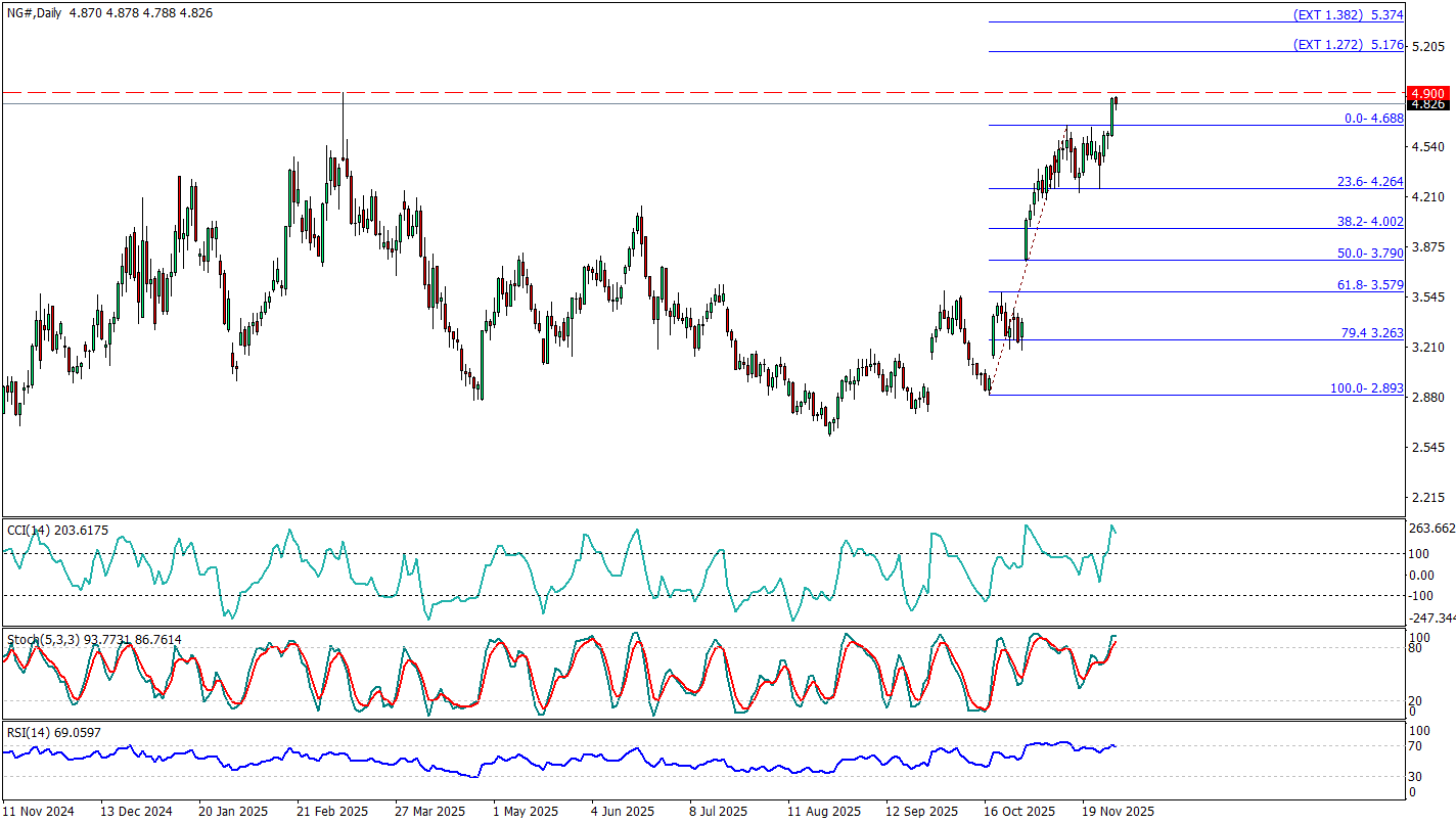 Günlük grafikte doğalgaz fiyatı, ekim sonundan beri süren güçlü yükseliş trendini koruyarak 4,68’in ve son dönemin yatay direnci 4,90’ın hemen altında fiyatlanıyor; bu bölgenin yukarı kırılması durumunda 5,17 – 5,37 bandındaki Fibonacci uzatma seviyeleri bir sonraki hedef bölge olarak izlenebilir. CCI’ın 200 seviyesinin üzerine çıkması ve Stokastik göstergenin 90’lı değerlerde seyretmesi, piyasada çok güçlü bir alım momentumu olduğunu ancak kısa vadede aşırı alım bölgesinde bulunduğumuzu, dolayısıyla 4,68 ardından 4,26 – 4,00 desteklerine doğru bir kâr realizasyonu riskinin olduğunu gösteriyor. RSI’ın 70 eşiğine dayanmış olması da ana trendin yukarı olduğunu teyit ederken, yeni pozisyonlarda bu destek-direnç seviyelerine dikkat edilmesi gerektiğine işaret ediyor. Son günlerde hareketin temel tarafında ise, ABD’de yaklaşan kış dönemi için daha soğuk hava tahminleri ve beklenenden güçlü depolama nedeniyle doğalgaz vadeli fiyatlarının dokuz ayın zirvelerine doğru tırmanması, küresel doğalgaz fiyatlarını yukarı destekleyen ana makro faktör konumunda.