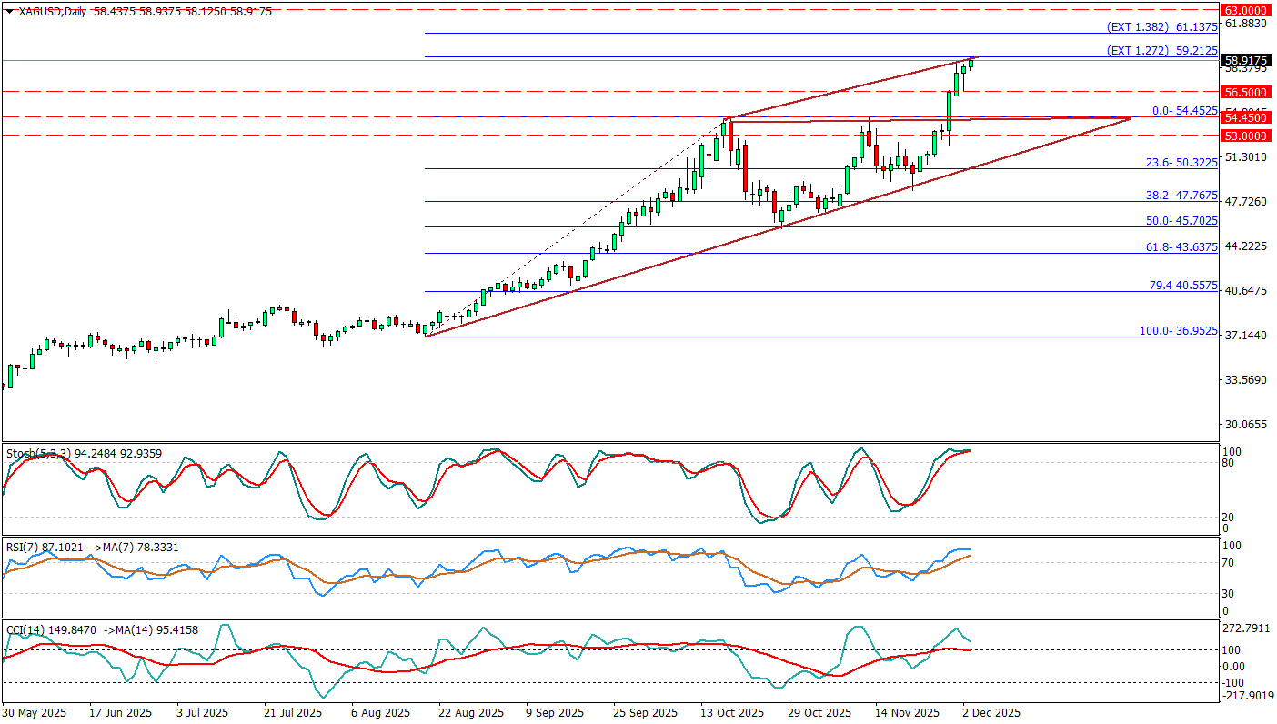 Ons gümüş günlük grafikte fiyat, Ağustos’tan beri süren yükselen trend çizgisi içinde üst banda yaslanmış durumda ve 58,80 civarındaki seyriyle 59,20 dolar civarındaki 1,272 Fibonacci uzatma seviyesine dayanarak burayı test etmeye çalışıyor. Stokastik osilatör 90’ın, RSI’ın 80’in, CCI ise +100’ün belirgin şekilde üzerinde kalarak momentumu teyit ederken aynı zamanda kısa vadede kâr realizasyonu riskinin de arttığını gösteriyor. Bu nedenle 56,50 ve özellikle 54,45–53,00 bandındaki yatay destekler ile yükselen trend çizgisi, olası düzeltmelerde ilk önemli savunma bölgeleri olarak öne çıkarken, 59,20’nin üzerinde kalıcı bir kırılma ise 61,10 dolar (1,382 uzatma) civarına doğru yeni bir rekor denemesini tetikleyebilir. Makro tarafta ralliyi besleyen ana unsurlar; Fed’in önümüzdeki döneme yönelik faiz indirim beklentileri ve buna bağlı zayıflayan dolar, yapısal arz açığı, gelen güçlü endüstriyel talep ile Londra depolarındaki fiziksel stokların son yıllarda belirgin biçimde erimesi; bu kombinasyon ons gümüşü 2025’te tüm zamanların zirvelerine taşıyarak teknik taraftaki bu agresif yükselişi desteklemeye devam ediyor.