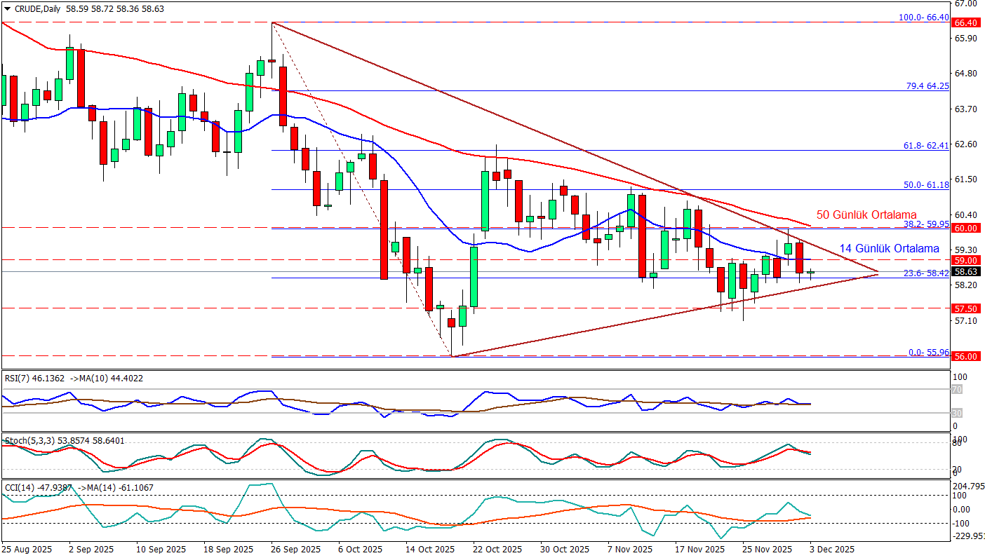 CRUDE OIL günlük grafikte fiyat, 55,96 dip bölgesinden gelen tepkiyle yükselen dipler ve 66,40 zirvesinden gelen alçalan tepelerin birleştiği sıkışan üçgen formasyonu içinde 58,60 civarında, 58,40 desteği ile kısa vadeli yükselen trend çizgisinin hemen üzerinde dalgalanıyor; yukarıda 14 günlük ortalama ve üçgenin üst bandı olan 60,00 bölgesi ilk kritik direnç, bunun üzerinde 61,20 ve 62,40 Fibo seviyeleri gündeme gelebilirken, 58,40 altında günlük kapanışlarda 57,50 ve 56,00 desteklerine doğru satış baskısı hız kazanabilir. RSI 50 seviyesinin hafif altında ve yatay seyrederek zayıf ama nötr bir momentum gösterirken, Stokastik osilatör orta bölgede aşağı kıvrılarak kısa vadede alıcıların isteksizleştiğine işaret ediyor; CCI negatif bölgede seyretmesine rağmen kendi ortalamasının üzerine tırmanması ise satış baskısının görece azaldığını, ancak henüz net bir alım durumunun oluşmadığını düşündürüyor. Makro tarafta ise OPEC+’ın 2026’nın ilk çeyreği için üretim artışlarını durdurmasına ve hâlâ 3 milyon varilin üzerinde gönüllü kesintiyi yürürlükte tutmasına rağmen, son haftalarda ABD’de beklentinin üzerinde gelen stok artışları ve 2026’ya yönelik arz fazlası endişeleri ile zayıf talep görünümü fiyatları 58–60 dolar bandına sıkıştırıyor; Ukrayna–Rusya hattındaki enerji altyapısı saldırıları ve Venezuela’ya yönelik saldırı riskleri de aşağı yönlü potansiyeli sınırlayan, destek faktörleri olarak takip ediliyor.