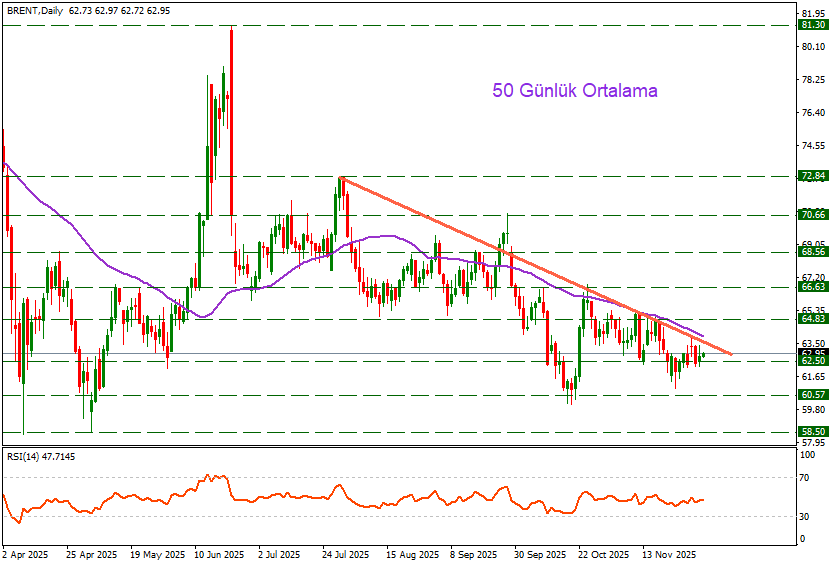 Brent petrol aşağı yönlü baskılarda 62.50 desteğinden yukarı yönlü tepkiler almaya devam ediyor. Fiyatlamalar gitgide 62.50 desteği ve düşüş trend çizgisi arasında daralıyor. Bu dar bölgeden çıkılacak yönde fiyatlamalar yoğunlaşabilir. Ancak fiyatlamalar şu sıralar 62.95 bölgesinde sakin kalıyor.