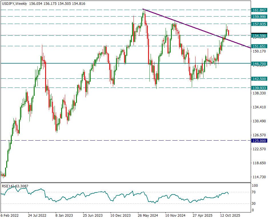 Dolar endeksindeki kayıp ile birlikte USDJPY paritesi de haftalık bazda Yen lehine belirgin bir şekilde hareket etti. USDJPY paritesinde Yen lehine düşüş ile birlikte 154.60 desteğine kadar geriledi. Bu düşüş ile birlikte Ekim sonunda kırdığı ve 161.85’den gelen downtend çizgisini tekrar test etmek isteyebilir. Ancak bu bölgenin altı düşüşün derinleşmesine sebep olabilir. BOJ’un sıkılaşma söylemleri Yen’i destekler nitelikte olduğundan 152’nin altında düşüş derinleşebilir.