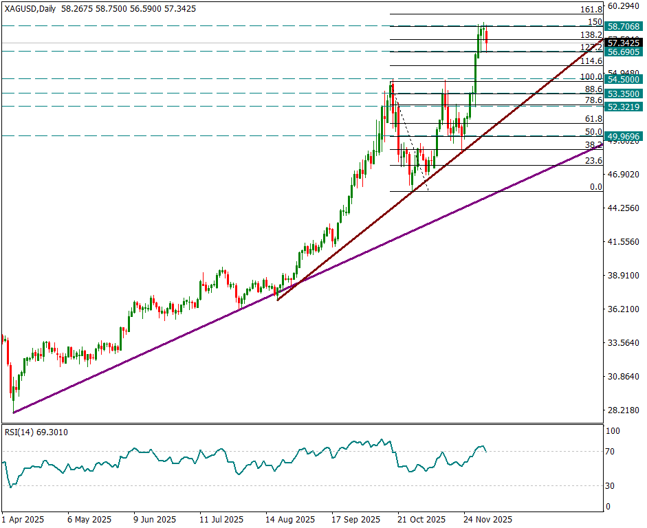 Ons Gümüş hafta içerisinde gördüğü 58.70 zirvesinin ardından bugün kar satışıyla 56.69’a kadar geriledi. Daha önceden 54.50 zirvesi ile 45.95 düzeltmesinin Fibonacci 150 bölgesinde denk gelen 58.70 direnci önemli bir teknik durak oldu. Olası kar satışları 56.69’un altında derinleşebilir ancak bu bölgede tutunması halinde Fibonacci 161.8 bölgesine denk gelen 60.10 seviyesi gündeme gelebilir.