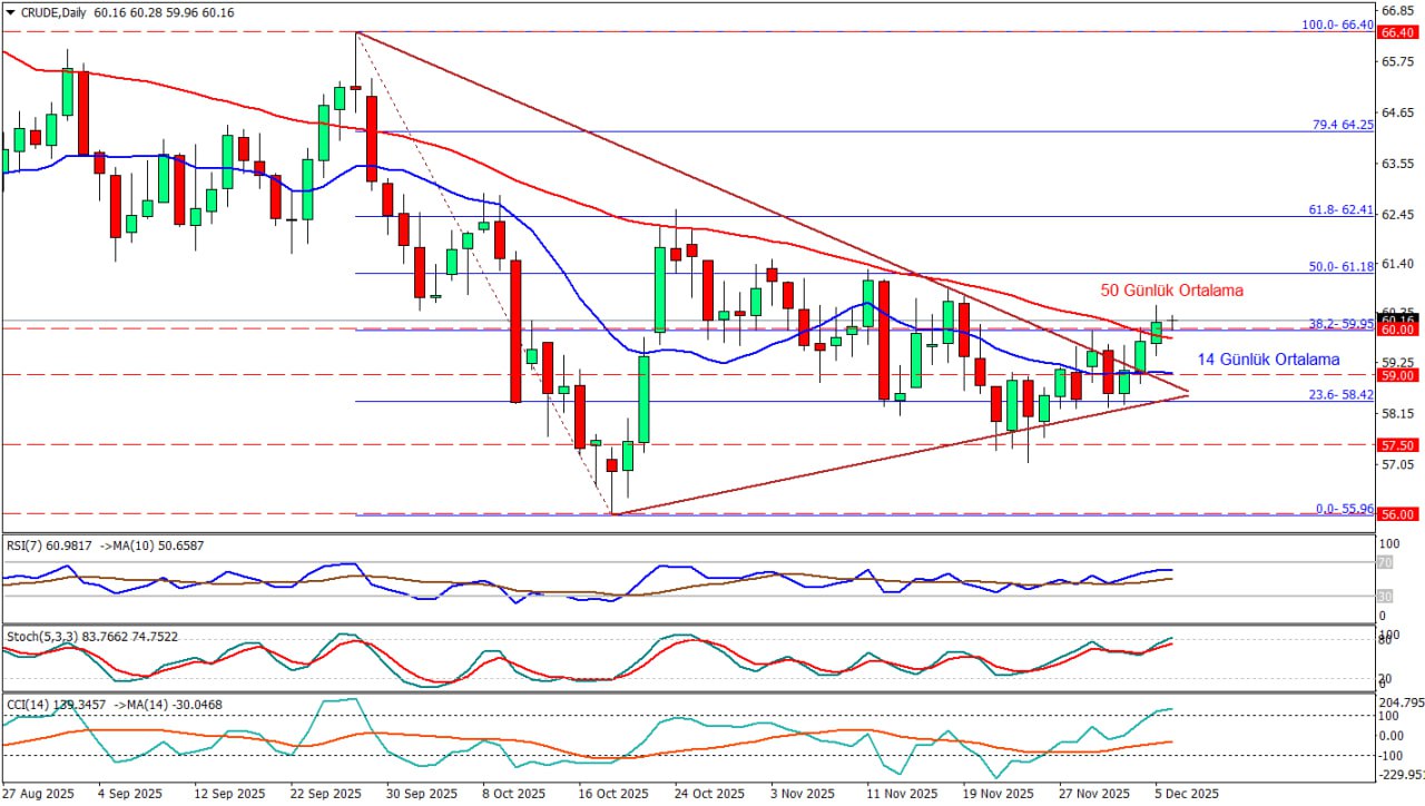 Crude Oil günlük grafiğinde fiyat, son haftalardaki sıkışmayı temsil eden simetrik üçgenin üst bandını ve 14–50 günlük ortalamaları yukarı kırarak 60 seviyesinin üzerine çıkarak burada tutunmaya çalışıyor. RSI 60’ın üzerinde ve kendi ortalamasının üstünde seyretmesi, Stokastik’in 80 eşiğini aşarak aşırı alım bölgesine girmesi ve CCI +100 üzerindeki değerleri, kısa vadede alıcıların kontrolü ele aldığını ancak momentumun da yavaş yavaş doygunlaştığını gösteriyor. Teknik taraftaki bu toparlanmayı, son günlerde OPEC+’ın 2026’nın ilk çeyreğinde planlanan üretim artışlarını durdurup arz disiplinini sürdürme kararı, Ukrayna’nın Rus petrol altyapısına yönelik saldırılarının ve tıkanan barış görüşmelerinin yarattığı arz riski primi ile birlikte FED’den bu hafta beklenen faiz indiriminin büyüme ve enerji talebi açısından pozitif algılanması desteklerken WTI’yi 60 dolar civarında iki haftanın zirvelerine taşımış durumda. Buna karşılık, ABD’de ticari petrol stoklarındaki artış ve orta vadede arz fazlasına işaret eden raporlar yukarı yönü sınırlamaya devam ediyor. Şimdilik 60 seviyesinin üzerinde olması ve burada tutunması pozitif bir görünüm yaratıyor.