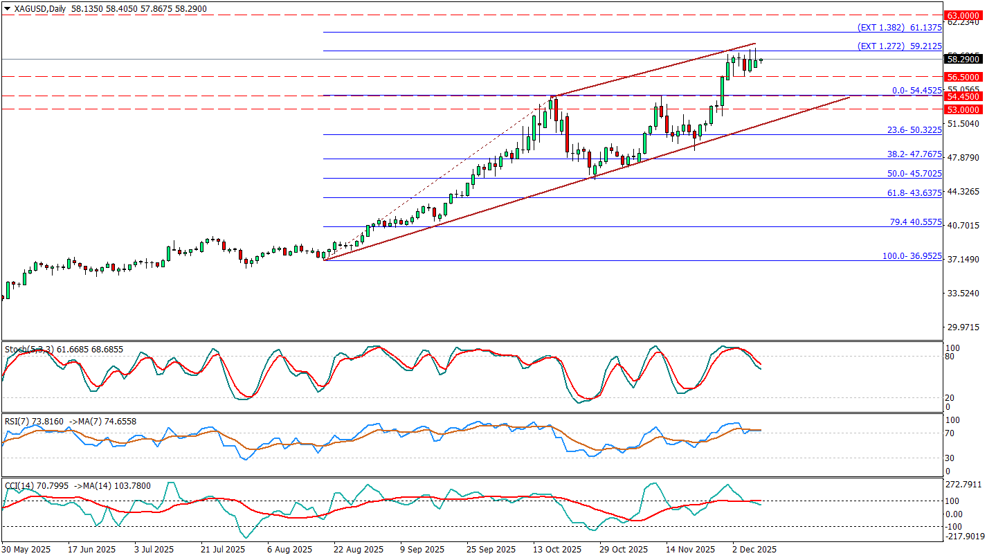 Ons gümüşte fiyat, güçlü yükseliş trend içinde çizilen yükselen kanalın üst bandına yakın 58–59 bölgesinde konsolide olurken, 56,50 seviyesi kısa vadeli ilk destek, kanal alt bandı ve 54,45–53,00 yatay bölgesi ise daha derin düzeltmelerde kritik ana destek alanları olarak öne çıkıyor. Stokastik osilatörün 80’den aşağı kıvrılması ve CCI’ın 100 üzerindeki zirveden geri dönmesi kısa vadede yorulma ve sınırlı kâr realizasyonu riskine işaret etse de, RSI’ın hâlâ 70’e yakın pozitif bölgede kalması ana trendin yukarı yönlü olduğunu söylüyor; bu görünümde 59,20 civarındaki Fibonacci uzatma bölgesi altında oluşan sıkışma, yukarı kırılırsa yeni zirve denemeleri, aşağı sarkarsa ise önce 56,50 ardından 54,45’e doğru teknik bir düzeltme potansiyeli barındırıyor.