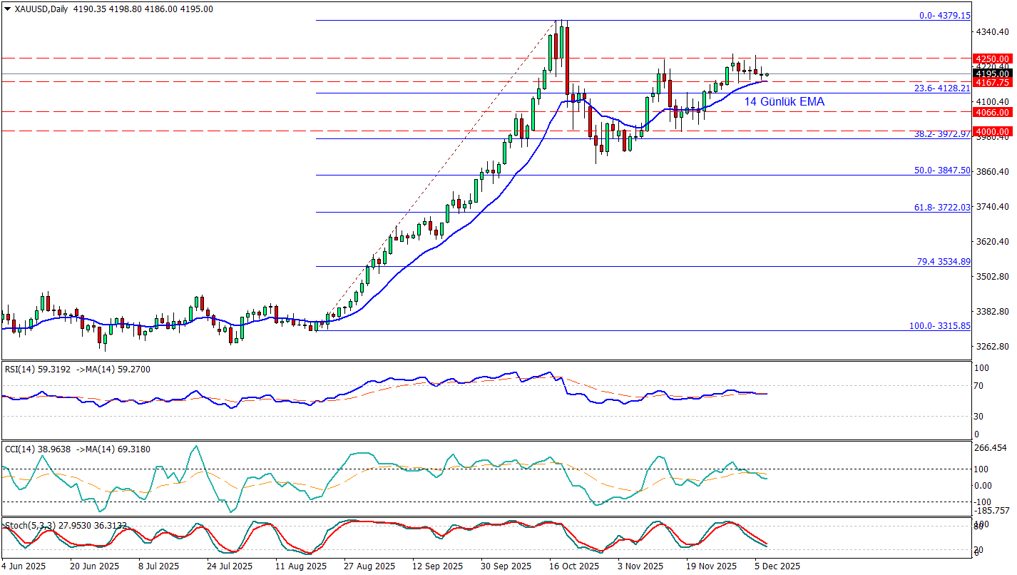 Ons altında 4.128 (23,6% Fibo) üzerinde, 14 günlük ortalamanın hemen üstünde yataya yakın bir konsolidasyon bölgesinde 4.250 bandını ara ara test eder bir pozisyonda bulunuyor. RSI’ın 60 seviyesi etrafında yatay seyretmesi trendin hâlâ pozitif ama ivmenin zayıfladığını, CCI’ın 0 üzerindeki geri çekilmesinin alım iştahının soğuduğunu, Stokastik’in ise 50’nin altına sarkarak kısa vadede yorulma ve olası bir düzeltme riskine işaret ettiğini görüyoruz. Bu çerçevede 4167 dinamik desteği ve 4.128–4.066–4.000 destek bölgesi üzerinde kalındığı sürece orta vadeli yükseliş yapısı korunurken, 4.250’nin üzerinde günlük kapanışlar yeniden 4.379 zirvesinin hedeflenmesini sağlayabilir; ancak göstergelerin işaret ettiği zayıflayan momentum nedeniyle bu seviyeye yaklaşan hareketlerde kâr realizasyonları da gündeme gelebilir.