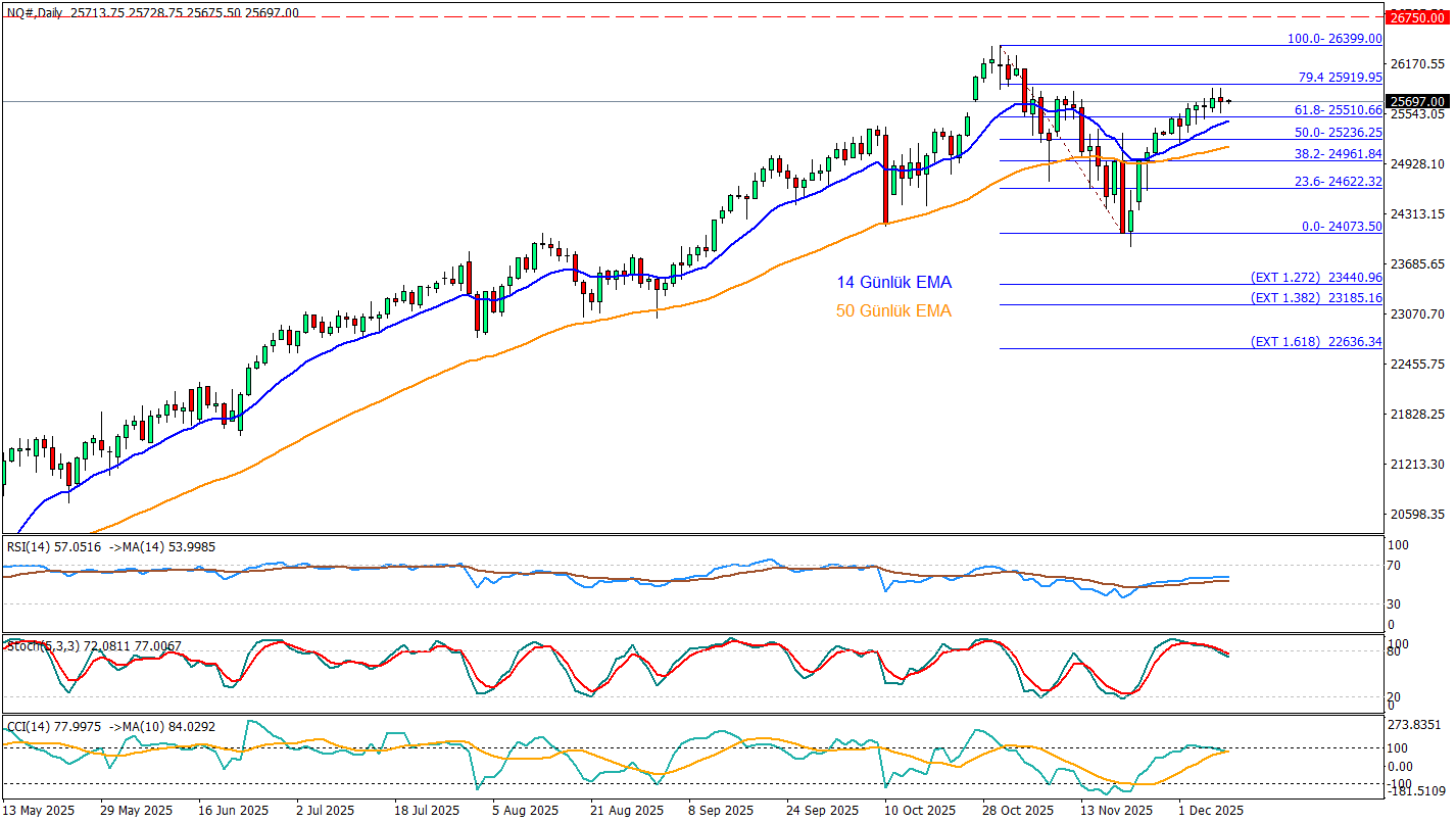 Nasdaq vadeli endeksinde orta–uzun vadeli yükseliş trendi 14 ve 50 günlük EMA’ların yukarı eğimi ve fiyatın yeniden her iki ortalamanın üzerine yerleşmesiyle korunurken, son düşüşte 24.073’ten başlayan düzeltmenin ardından endeks 25.510 (61,8% Fibo) seviyesi üzerini test ederek 25.700’ler civarında yatay bir toparlanma sürecine girmiş görünüyor. RSI’ın 50’nin üzerinde 57 civarında seyretmesi ve CCI’ın pozitif bölgede kalması trend lehine pozitif momentumun devam ettiğine işaret ederken, Stokastik’in 70’li seviyelerde yukarıdan aşağı kesmesi, 25.919 (79,4% Fibo) – 26.399 (son zirve) bandının kısa vadede güçlü bir direnç kümesi olduğuna ve bu bölgeye yaklaşan hareketlerde kâr realizasyonu ile yatay/sınırlı bir geri çekilme görülebileceğine, buna karşın 25.510–25.236 destek bölgesi üzerinde kalındığı sürece yükseliş denemelerinin ön planda kalabileceğine işaret ediyor.