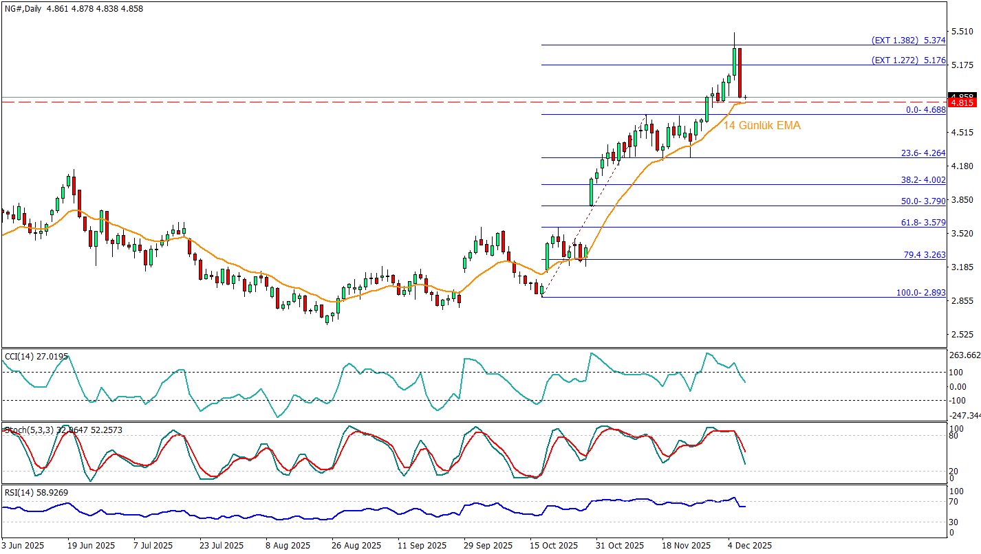 Doğalgazda son rallinin ardından fiyat, 5,17–5,37 bandından sert satışla geri çekilerek önceki yatay direncin de geçtiği 4,815 civarına kadar düzeltmiş durumda; RSI yaklaşık 59 seviyesinde bulunurken yataylaşmaya başlamış bir görüntüde bulunuyor, Stokastik’in aşırı alımdan aşağı kesmesi ve CCI’daki geri dönüş, kısa vadede momentum kaybı ve kar realizasyonuna işaret ediyor. Bu teknik düzeltmenin arkasındaki ana temel neden ise, güncel hava durumu modellerinin Aralık’ın ikinci yarısında ABD’de önceye kıyasla daha ılık bir hava ve daha düşük ısıtma talebi öngörmesiyle birlikte rekor seviyelere yakın üretim, yüksek stoklar ve küresel gaz fiyatlarındaki görece gevşemenin, geçtiğimiz hafta görülen “soğuk hava kaynaklı” yükselişi hızla geri aldırması olarak görünmekte. 14 günlük ortalamadan bir tepki ile tekrar önümüzdeki günlerde 5.17’lere tırmanma gösterebilir.
