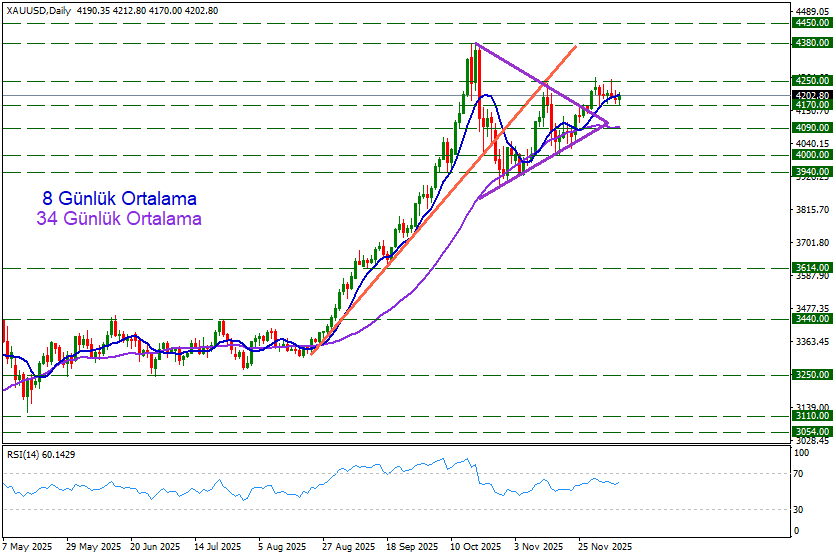 Ons altın yarınki FED faiz kararı öncesinde 4170 – 4250 aralığındaki yatay bölgede sakin kalmayı sürdürüyor. Gün içindeki satış baskılarında 4170 bölgesi destek olarak tepki verdi. Anlık fiyatlamalar ise 4202 bölgesinde işlem görüyor.