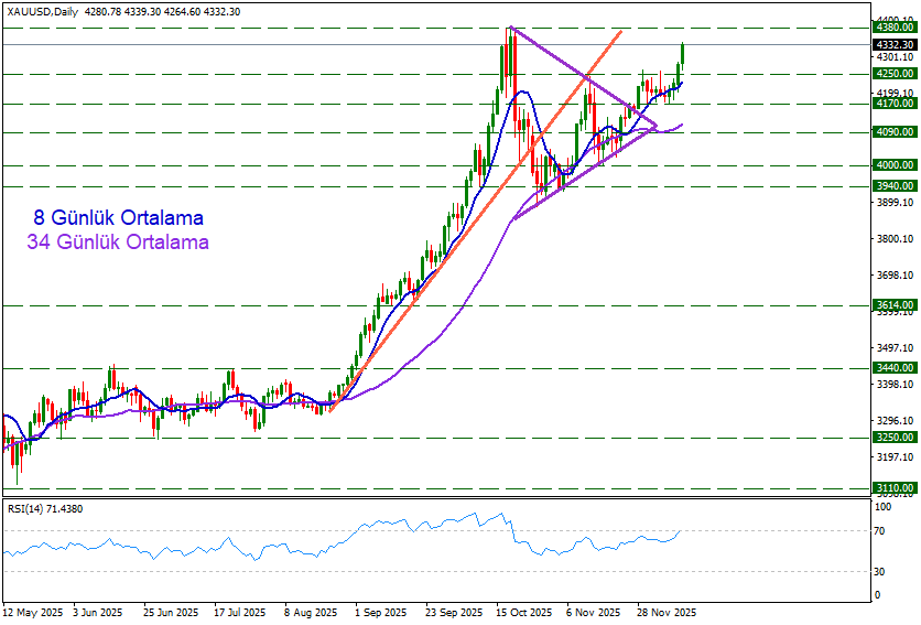 Anlık fiyatlamalar gün içi zirveye yakın kalmayı sürdürürken yukarı yönlü hareketlerin devamında rekor seviye olan 4380 bölgesi direnç oluşturabilir. Bu direncin aşılması durumunda yükselişler hız kazanabilir ve bir sonraki direnç bölgesi 4450 olarak takip edilebilir.