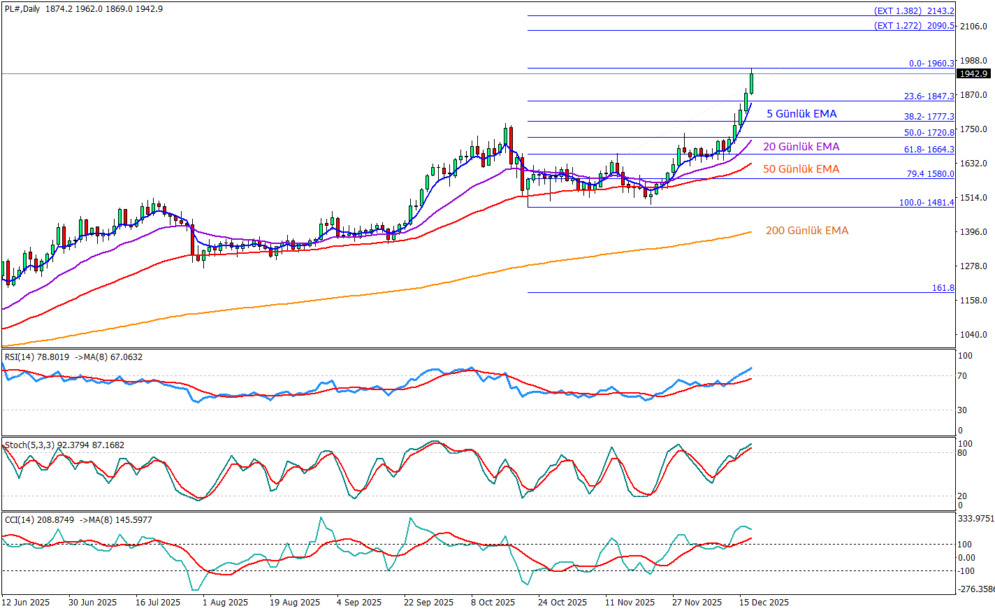 Güney Afrika’daki zayıf üretim sinyalleri ve Dünya Platin Yatırım Konseyi’nin 2025 için 69.200 ons arz açığı (üst üste üçüncü yıl) öngörüsü, fiyatı “temel” tarafta destekliyor. yükselişin hızını belirleyecek ana değişkenin talep tarafı olacağını düşündürüyor. Teknik olarak yaklaştığımızda ise Platin 1.943 doların üzerine çıkarak 2008’den bu görülen zirvenin üzerinde işlem görmeye devam ediyor. Önceki konsolidasyon bandını yukarı kırdıktan sonra çok dik bir momentum hareketiyle 1.950 bölgesine dayandı. 5/20/50/200 günlük EMA’ların yukarı yönlü konumlanması trendin net biçimde pozitif olduğunu söylerken, RSI 78, Stochastik 92 ve CCI 209 gibi aşırı alım göstergeleri rallinin bir miktar “ısındığını” ve kâr realizasyonu riskinin arttığını işaret ediyor ama henüz dönüş ile ilgili net bir resim yok.