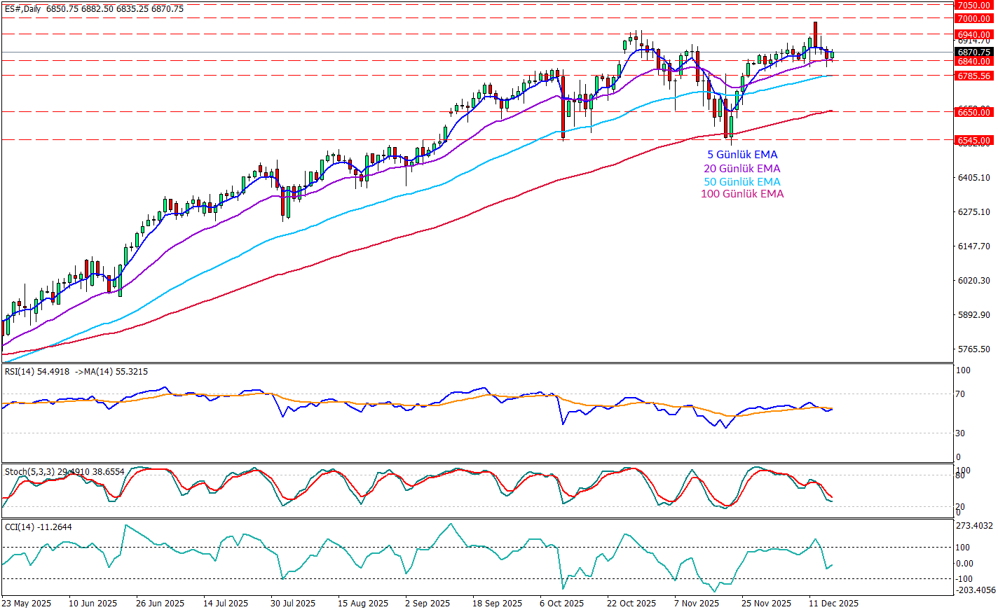 SP500 vadelisi genel resimde yükselen trendini koruyor fiyat hâlâ yukarı eğimli 50 ve 100 günlük EMA’ların üzerinde kalarak “trend bozulmadı” mesajı verirken, son bölümde 6.880–6.915 bandı altında yatay bir yapı dikkat çekiyor. Kısa vadede 5 ve 20 günlük EMA’ların birbirine yaklaşması momentumun bir süreliğine soğuduğunu gösteriyor. RSI 55 ile nötr-pozitif bölgede, CCI’nın sıfıra yakın seyri kararsızlık temasını destekliyor. Stokastik’in 30’lara gevşemesi ise kısa vadede düzeltme riskinin sürdüğünü söylüyor. Öte yandan SP500 kazanç getirisi (Earnings Yield) Dot.com krizinden bu yana görülen en düşük seviyeye gerilemesi endeksin pahalı olduğunu ve ilerleyen süreçte bir düşüş yaşayabileceğine dair risk barındırıyor.